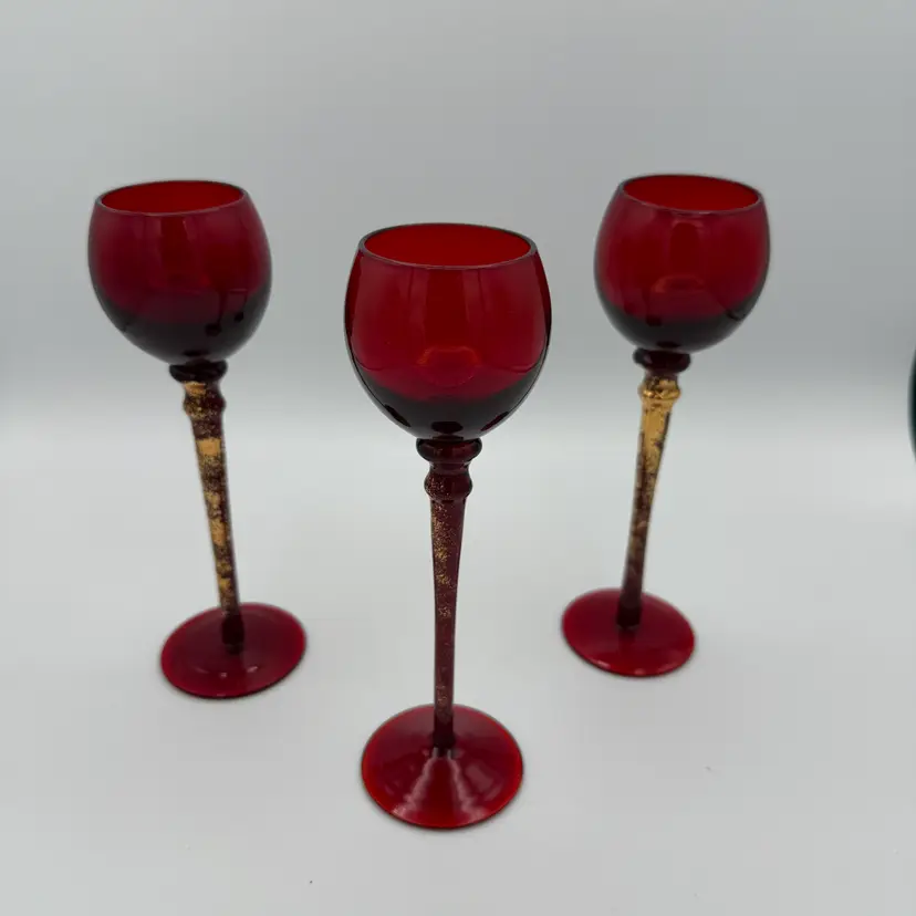 Ruby Red Glass Set of 3 Cordial/Goblets Liqueur With Gold Flecks on Stem. Great to Add to Any Barware. No Chips/Cracks. 6 1/2" Tall.
