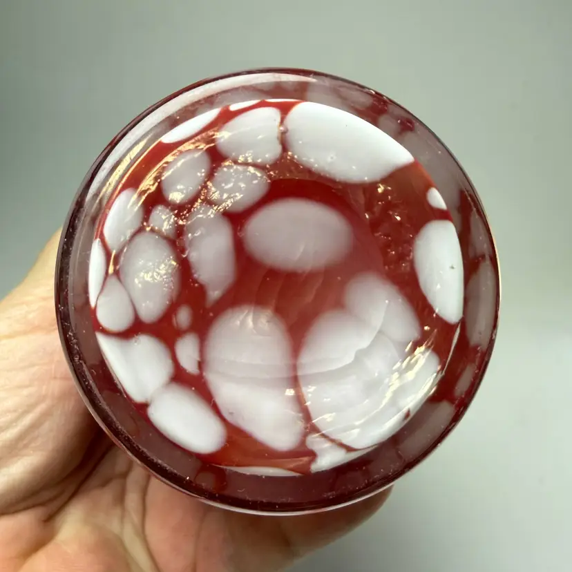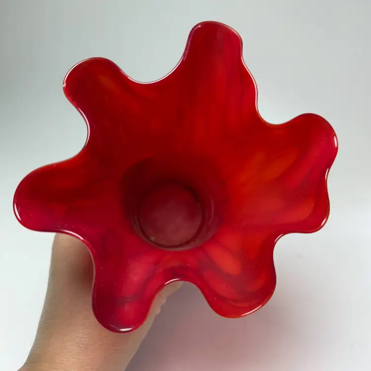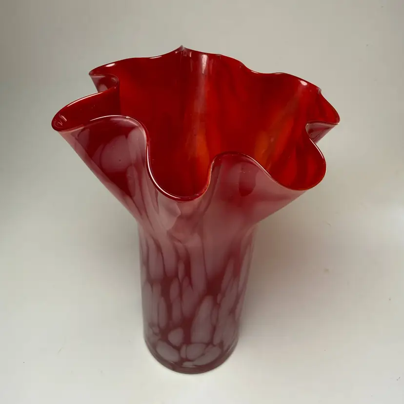 Ruby Red Speckled 8" Art Glass Handkerchief Vase Hand Blown Ruffle Stretched Flower. About 8" tall x 6.5" diameter opening on mouth. No chips, no cracks. Unsigned.