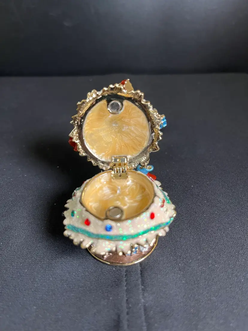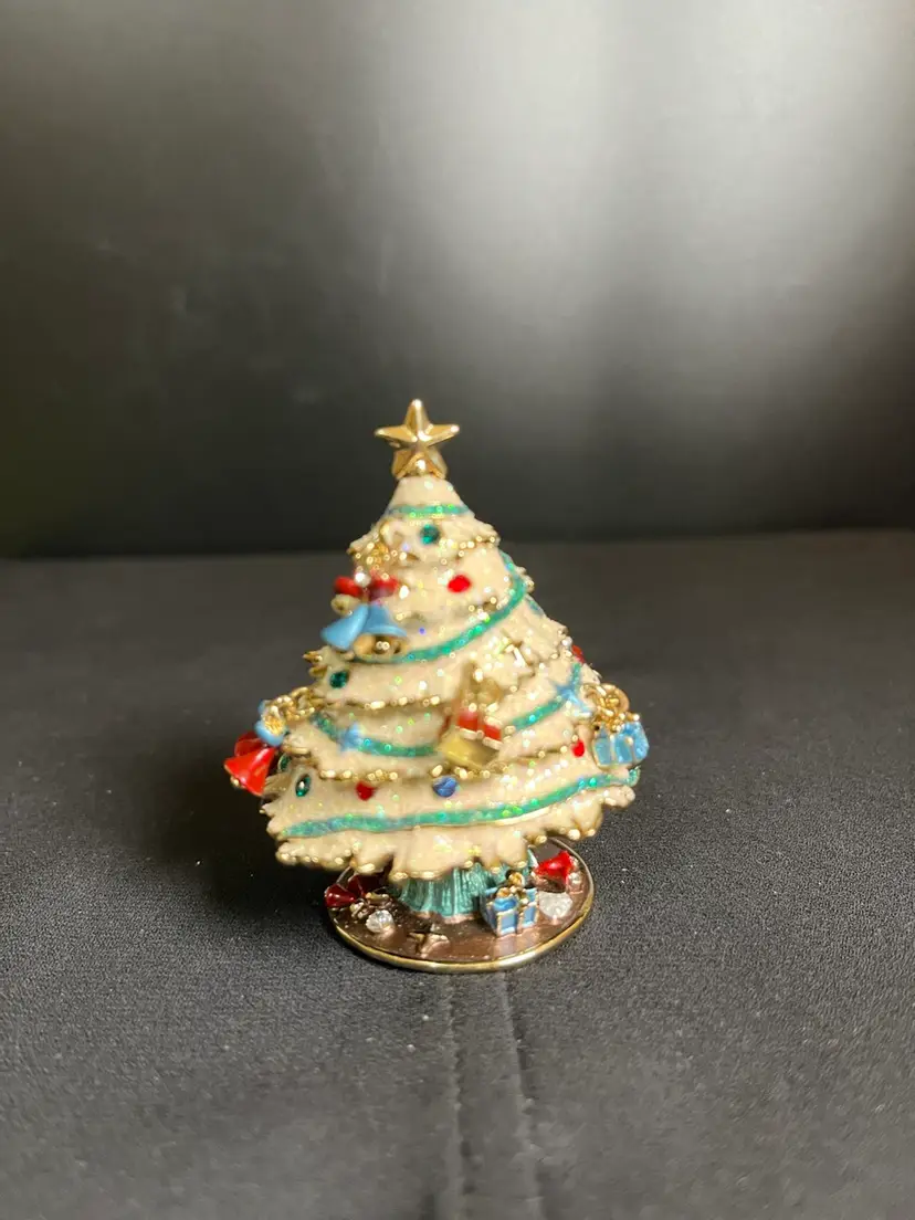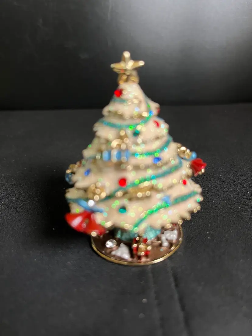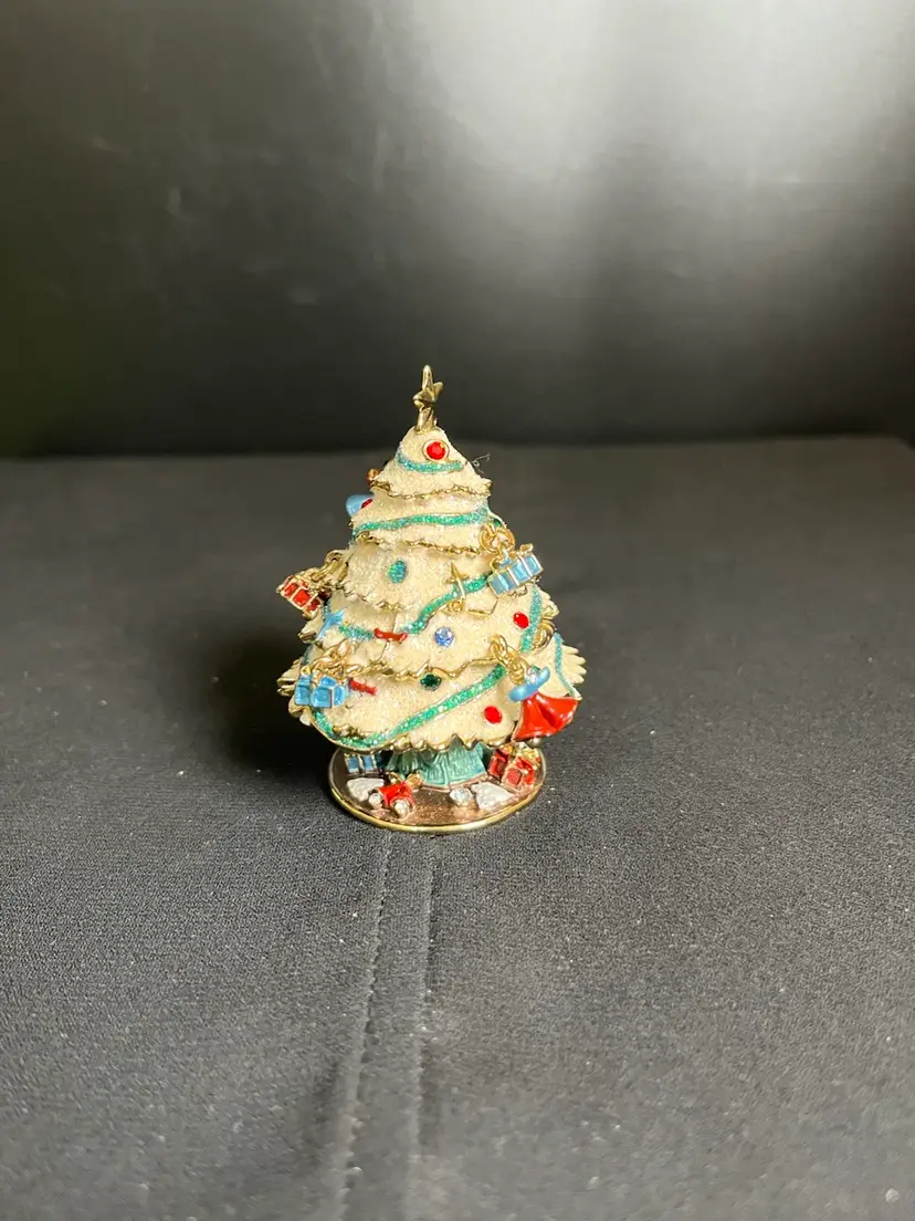 This is beautiful. Features random ornaments hanging from the tree. Beautifully finished inside with enamel paint. There is nothing wrong with this beauty, it is in great pre loved vintage condition. It measures approx 2.75"H, 2" at widest point, 4.6 Oz.