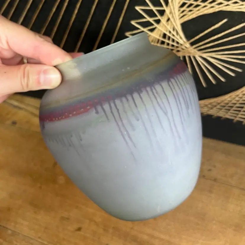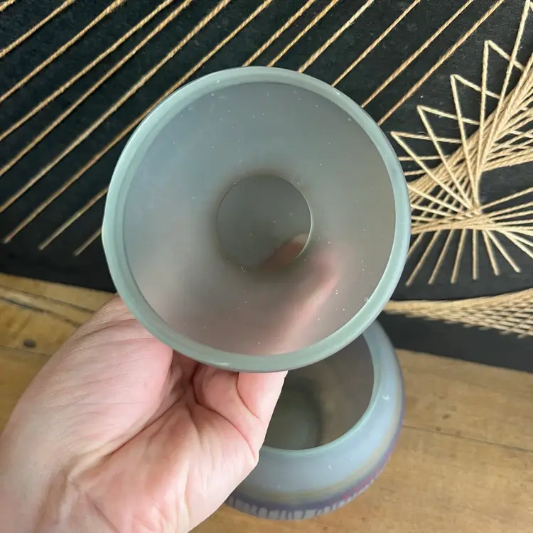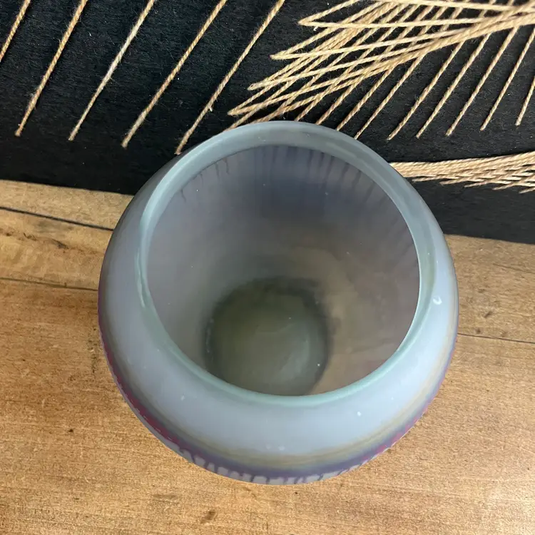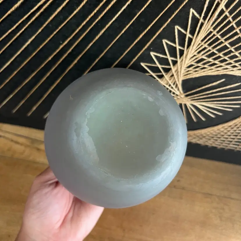 Approximately 9” tall with 3.25” opening and 5” diameter at its widest. No chips or cracks.