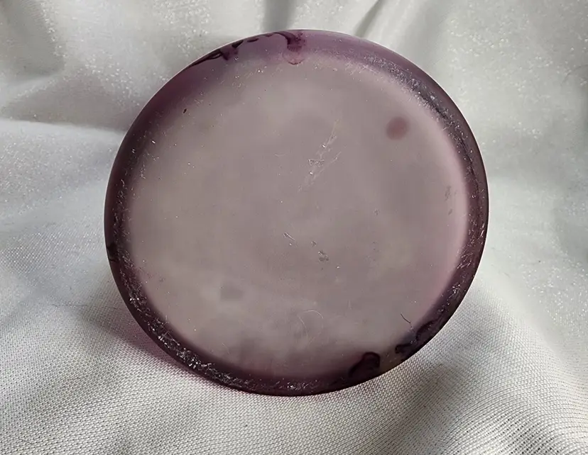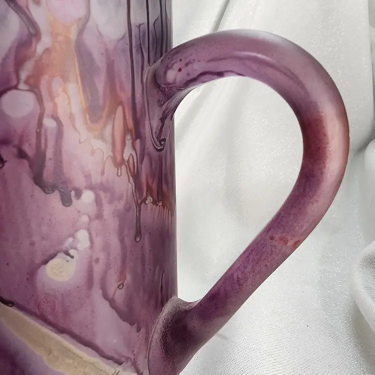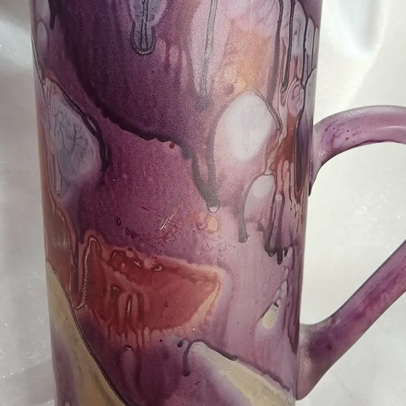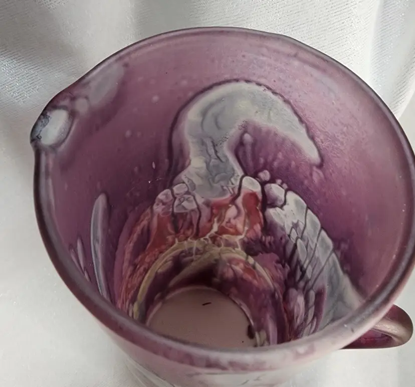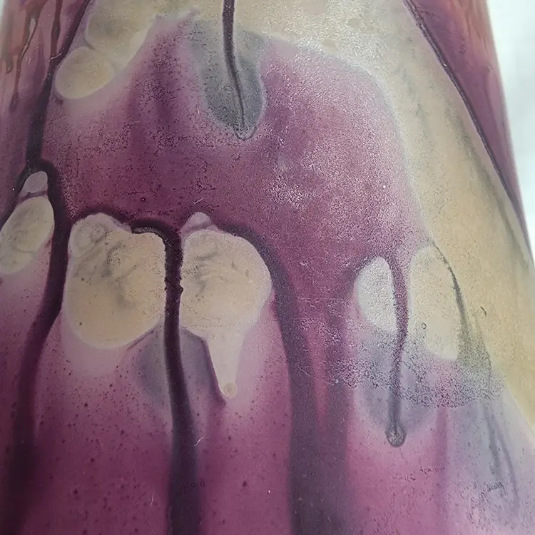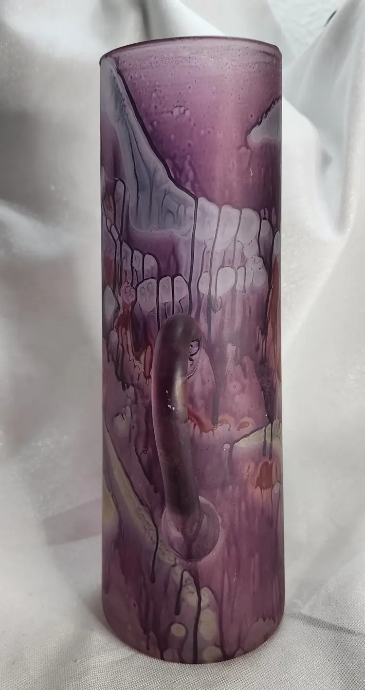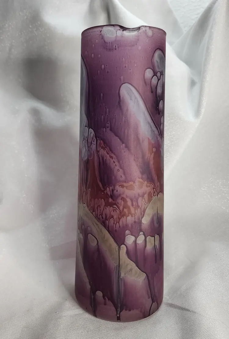 Shades of Purple, light grey, yellow & rose drip pattern over frosted glass. Anything that looks like an imperfection, is just part of the painting process.