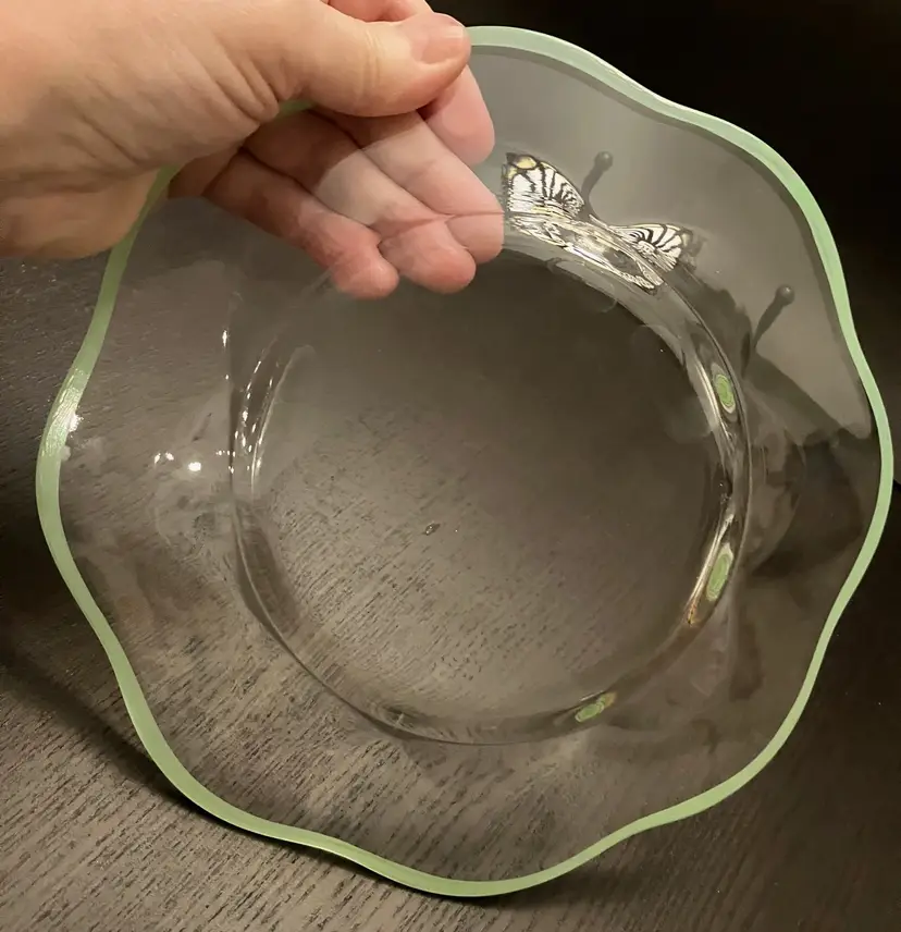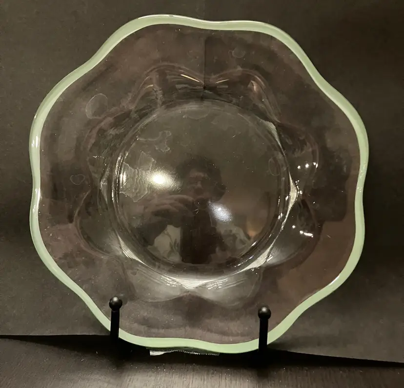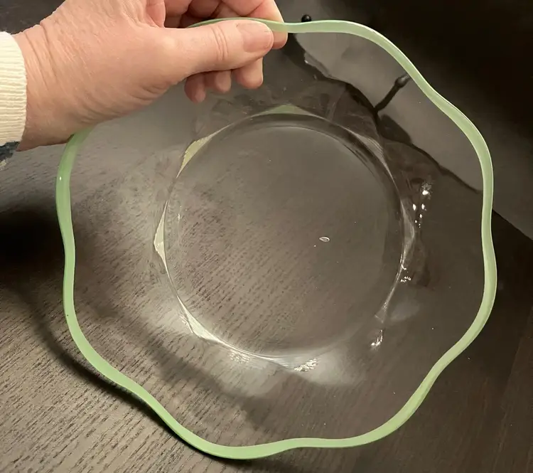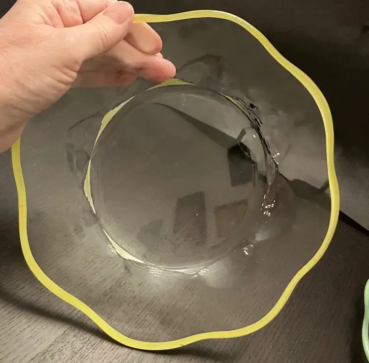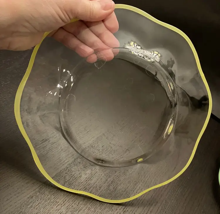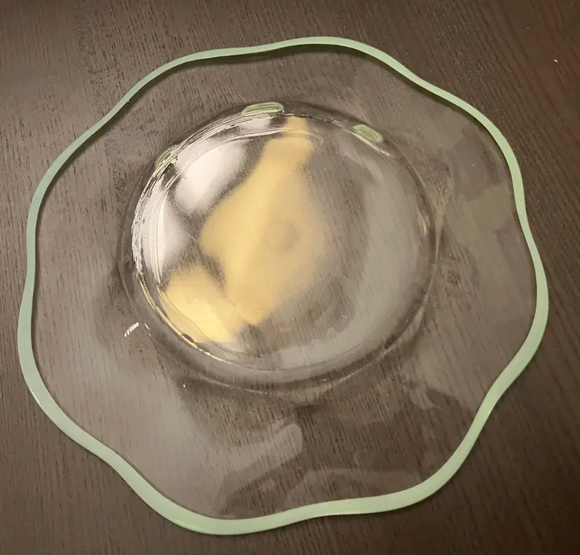 6 Glass plates. There is an inclusion air bubble in one of the green rimmed plate. Measures about 8 1/4" in diameter. Weighs 7 lbs before packaging.