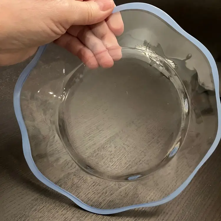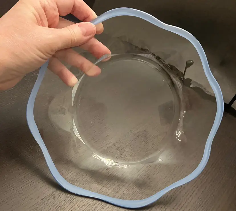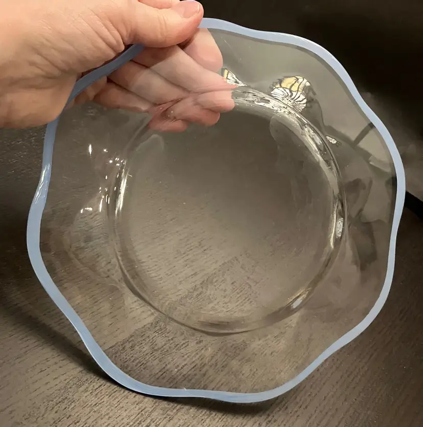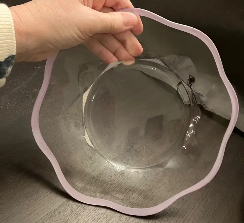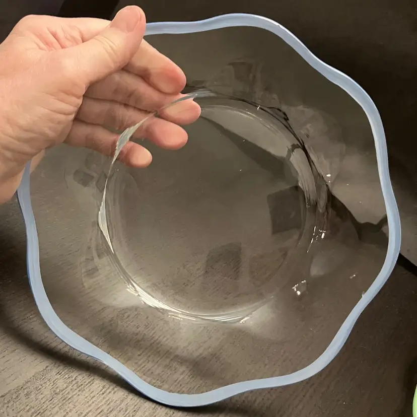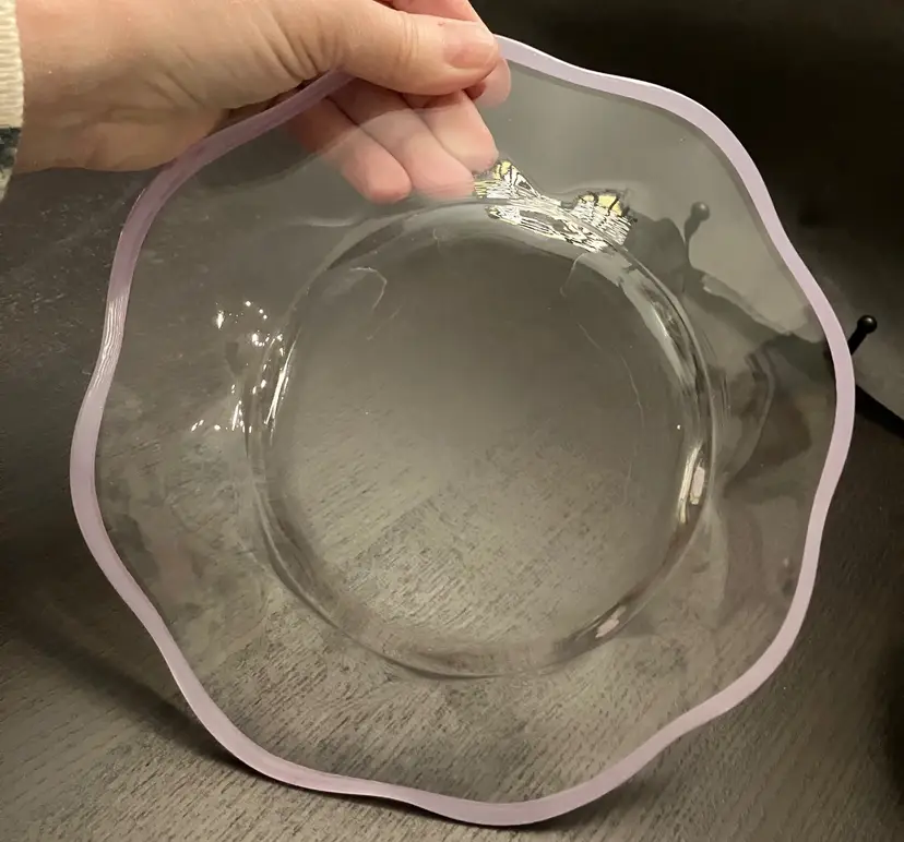 6 Glass plates. There is an inclusion air bubble in one of the green rimmed plate. Measures about 8 1/4" in diameter. Weighs 7 lbs before packaging.
