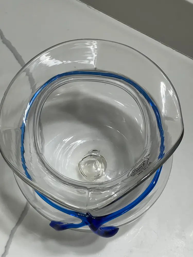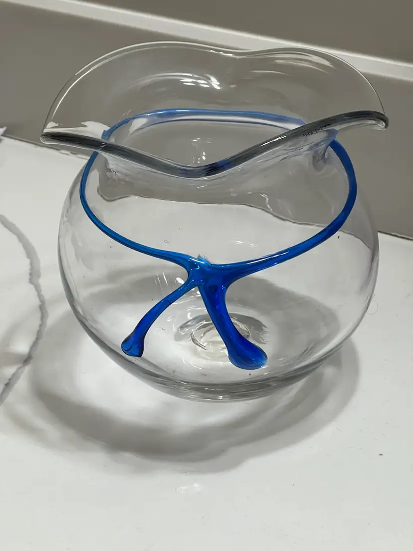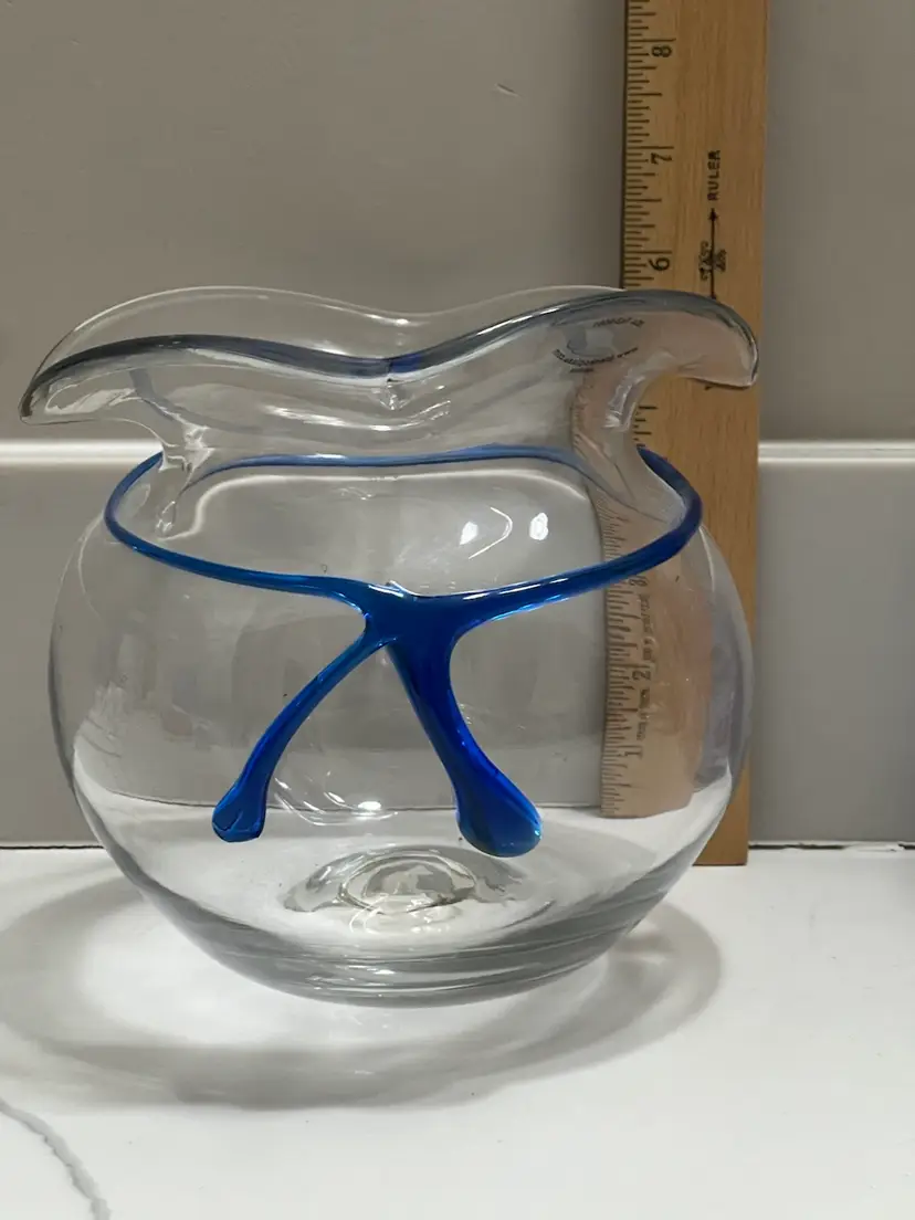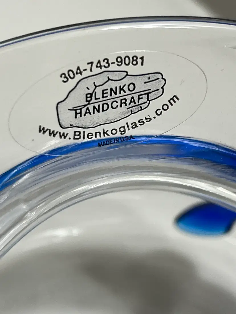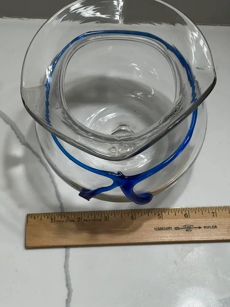 Reminds me of a deconstructed Fenton piece. So pretty and versatile Blenko vase with striking cobolt blue tie. Gorgeous condition with original sticker.