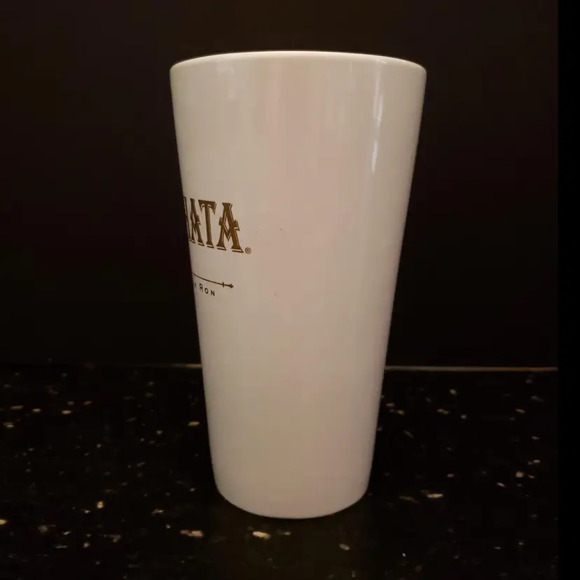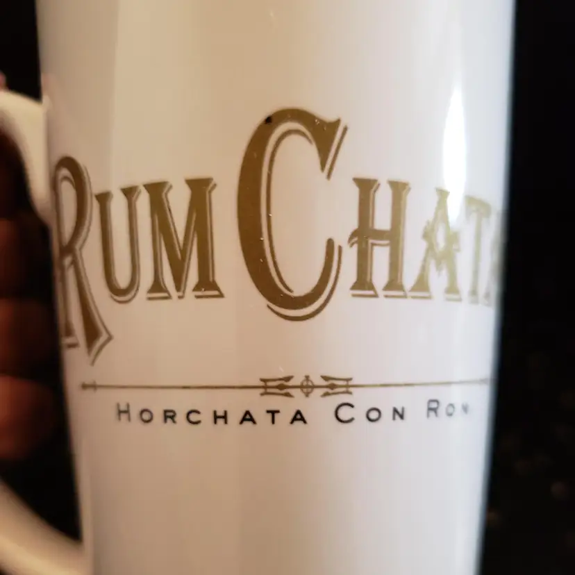 Rum Chata Horchata Con Ron Ceramic Coffee Tea Mug or Cup Tall Style White with Gold Print logo Measures approx. 6” Tall Holds 14 oz