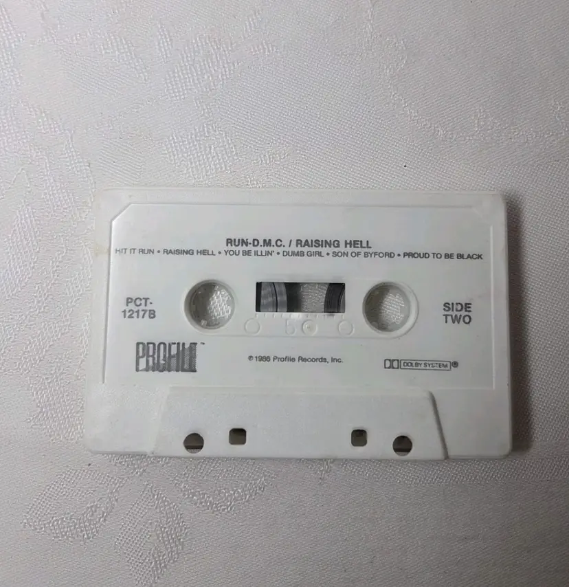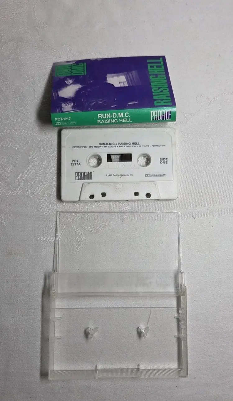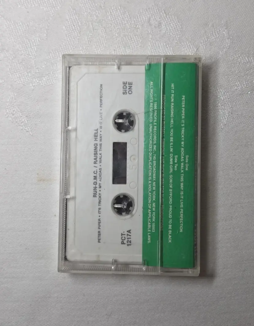 The product is a vintage 1986 cassette of Run DMC's album "Raising Hell" on Profile Records. The cassette features the iconic hip-hop group's signature style of old school and jive music, sung in English. In a clear jewel case with a purple and green design, this cassette is a must-have for any fan of classic rap and hip-hop from the 80s. With the inclusion of the original inlay in very good condition, this album is sure to bring back nostalgic memories of the golden age of hip-hop.