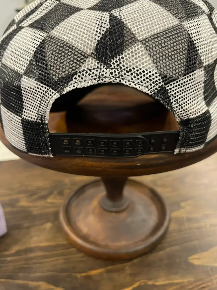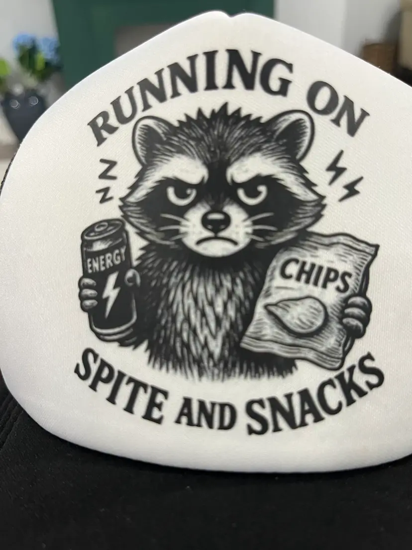Adorable raccoon design "Running on Spite and Snacks" on a black trucker hat with checkered mesh!! Unisex style SnapBack adjustable hat! Chain accessories are available as an add on option!! Several available and I will send photos of options (multi gold tone, silver tone and pearl available!) If you want a different colored hat, please message me!!
