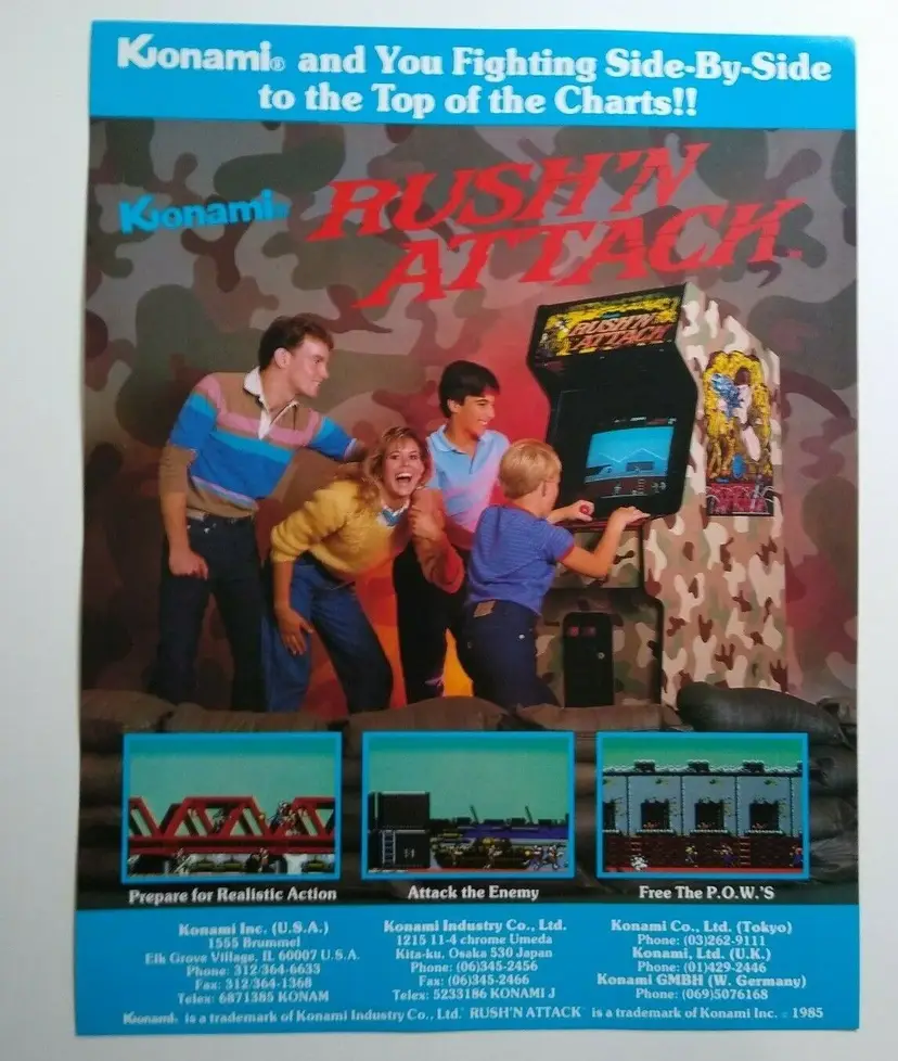 Material: Paper Arcade: Flyer Modified Item: No Country/Region of Manufacture: United States Original/Reproduction: Original Year: 1985 Game Title: Rush N Attack Brand: Konami Theme: Combat