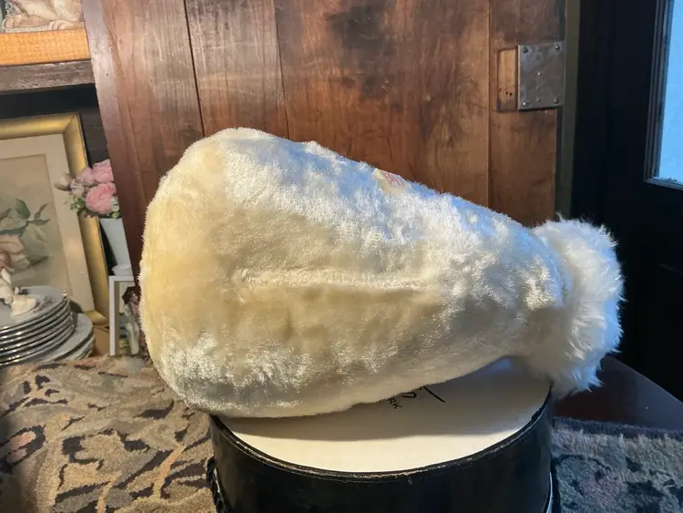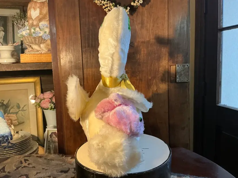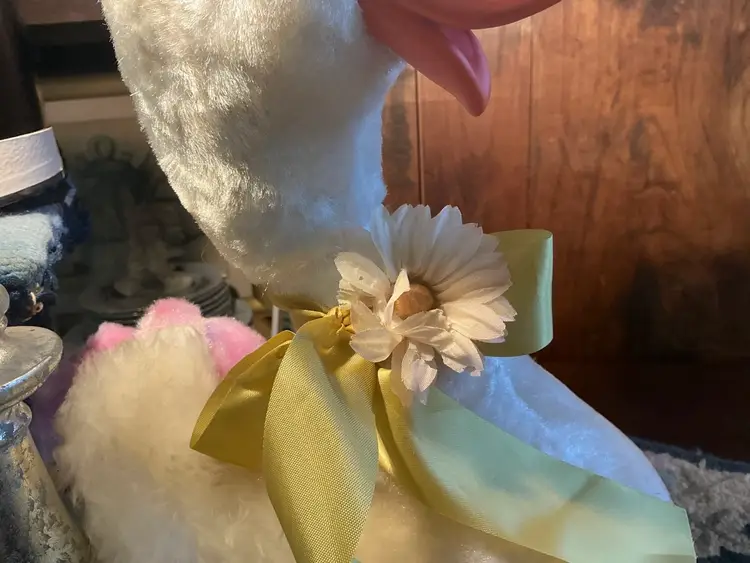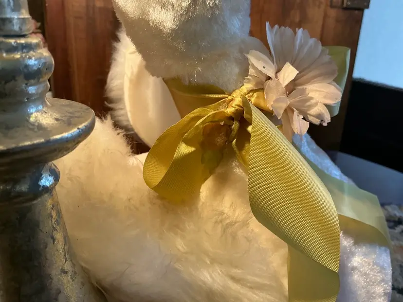 Condition: The Satin Ribbon has two applied daisy flowers, one has damage to a few peddles and the other is completely missing the peddles. There is wear to the plastic of the eyes- some scratching. There is some discoloration to the body. This piece needs support to sit upright.