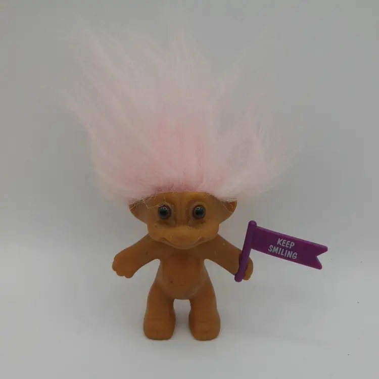 This is a vintage RUSS 3" Light PINK Hair Troll Holding Purple Sign. 'Keep Smiling' It's in very good condition! I have lots more trolls I am listing!
