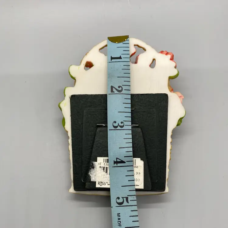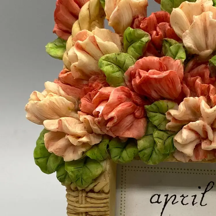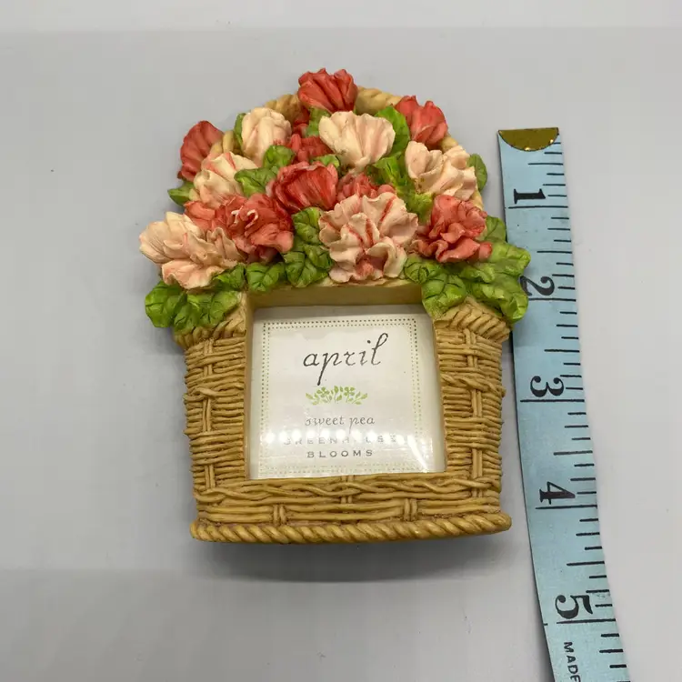 Vintage mini Russ Berrie 3D picture frame Greenhouse Blossoms Flowers of the month series April flower Sweet Pea Woven Wicker Basket shape easel back tiny nick on flower (see pic) pic 2" x 2" frame 5" tall