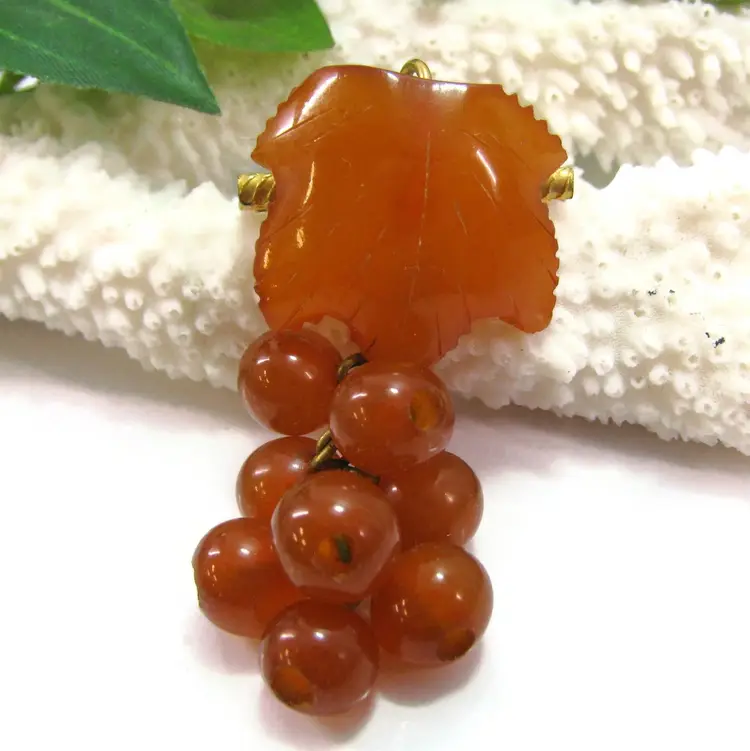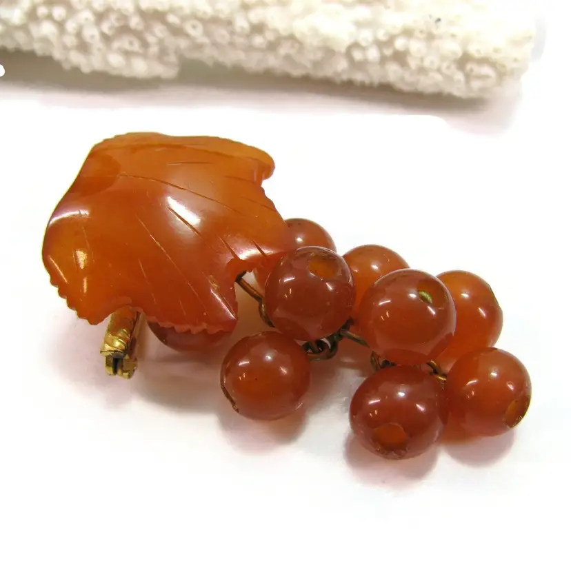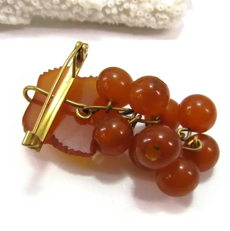 This is a wonderful Russian amber pin featuring a dangle design of a carved "grapes" dangles.