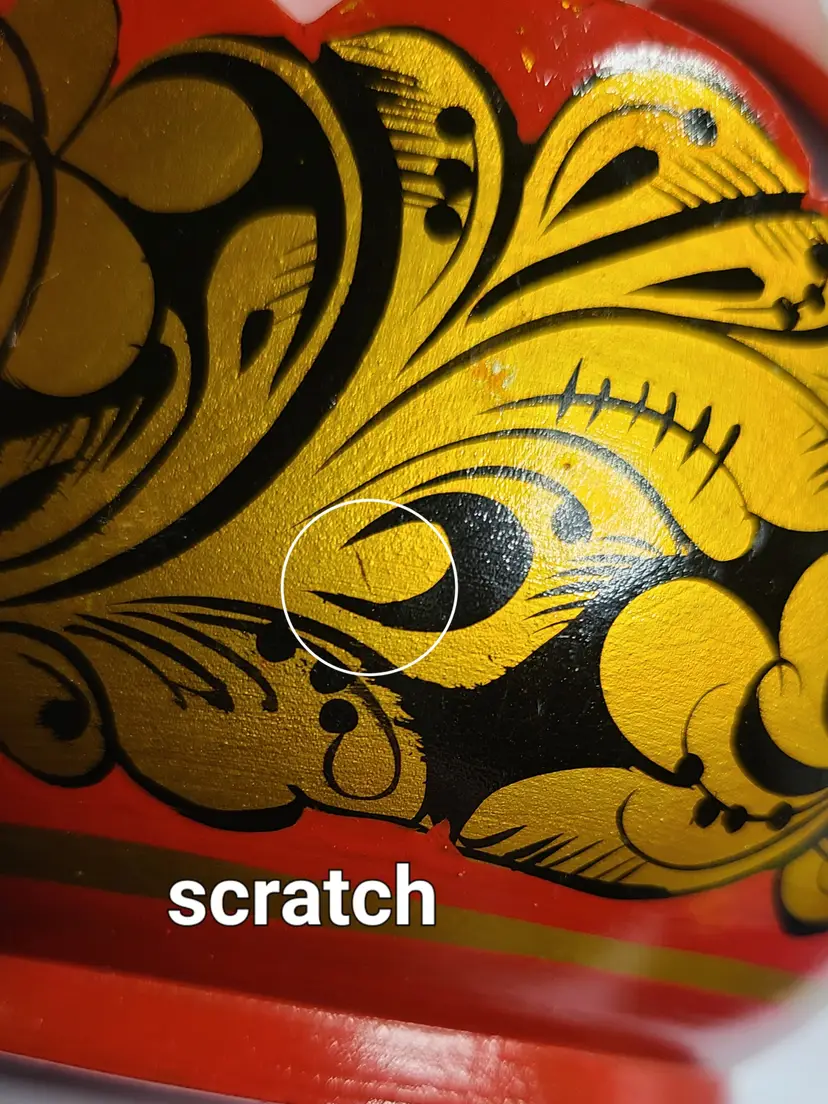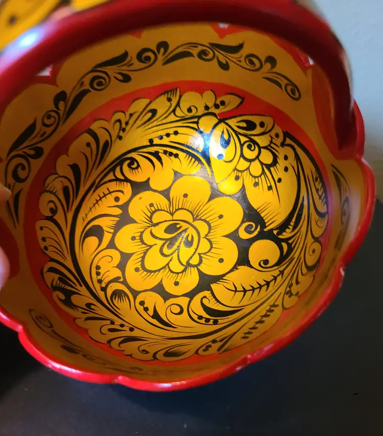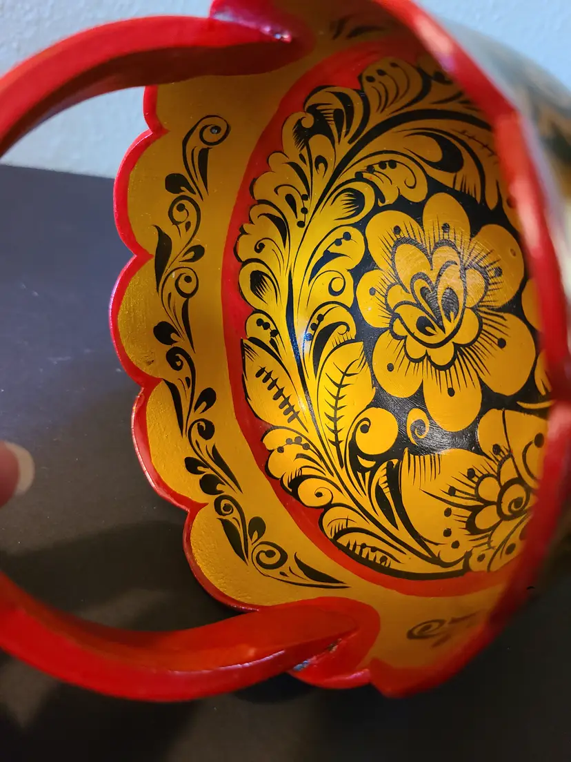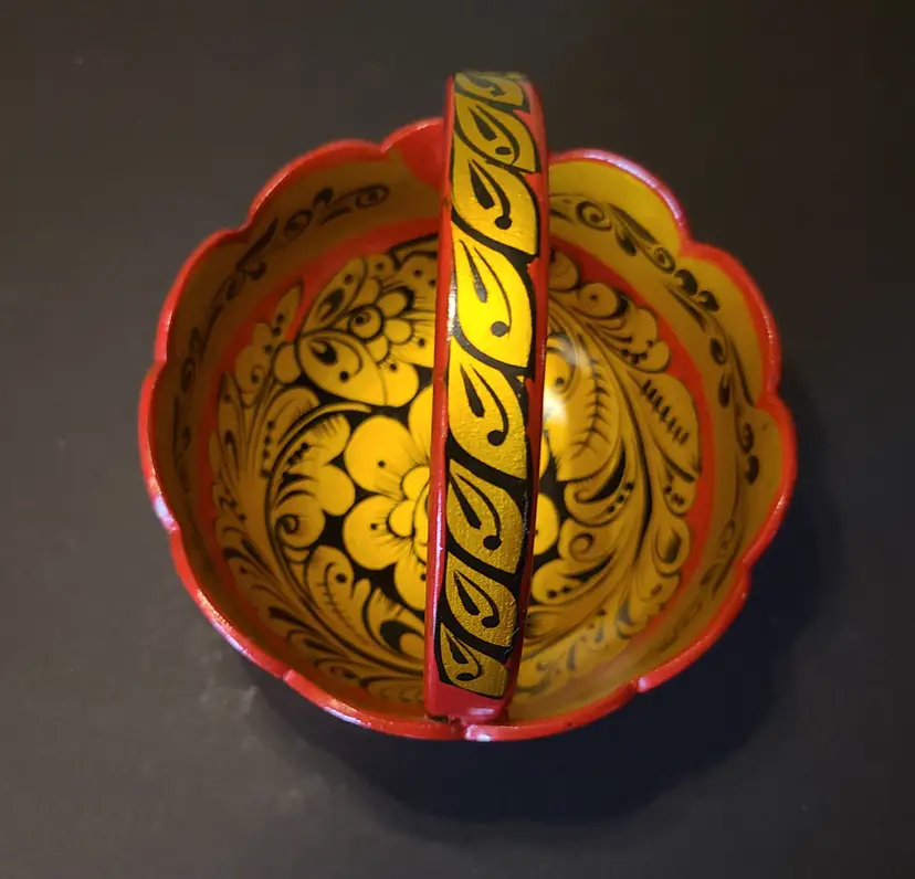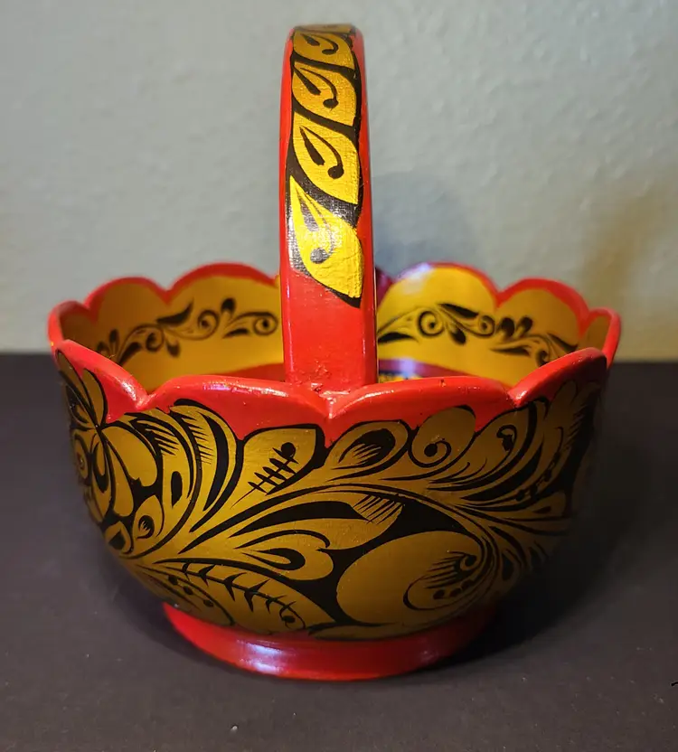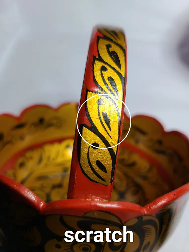 Pretty little basket. It's really neat how artists create pieces like this. Please see pics of small scratches to finish. Measures approx 4-1/2" tall including handle. Basket portion is approx 2-5/8" tall. Width at rim is approx 4-5/8".