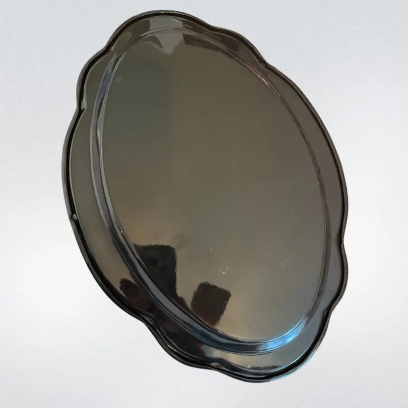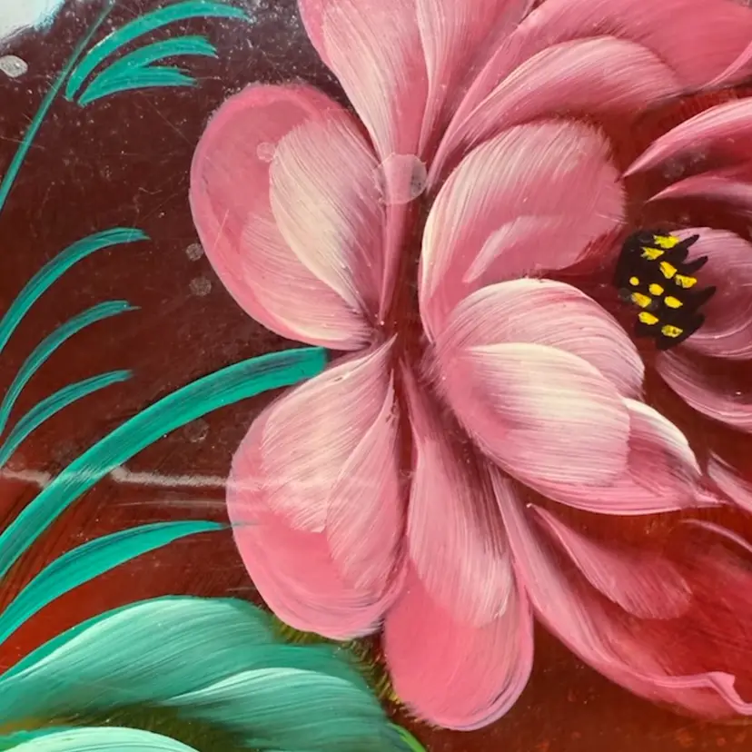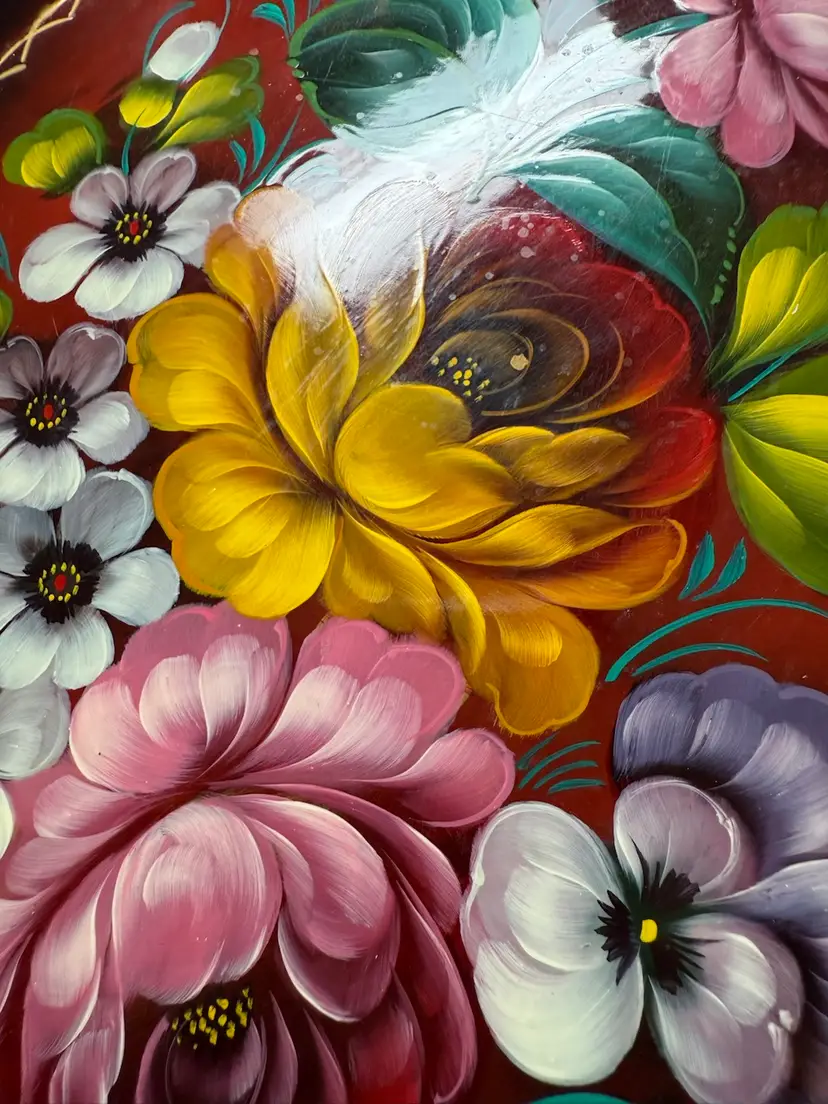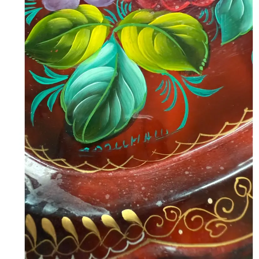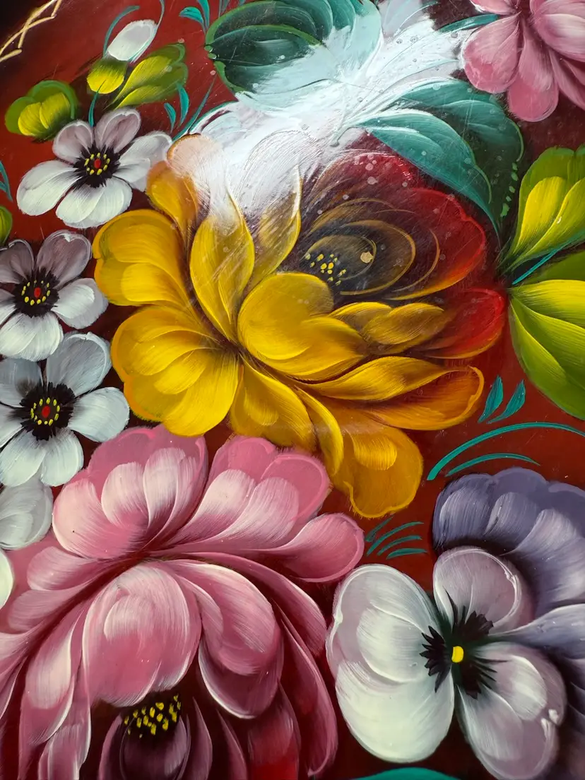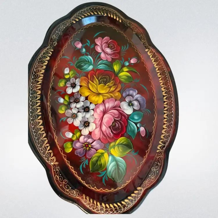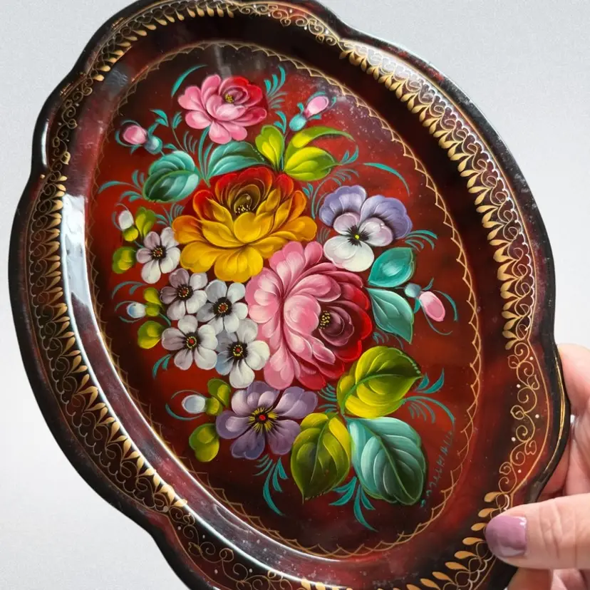 Hand painted Russian Zhostova metal tray. Tray is oval. Reddish orange black with pink, yellow, white, and lavender flowers and green leaves. It has an ornate gold edging handpainted in oils. There are several layers of lacquer to protect the art. It is signed, however, it appears that some of the signature has been rubbed off during lacquering and can’t be read. There are some small bubbles and scuffing in some of the lacquer as seen in photos. It is in good condition. Measures 13”x9”x1/2”