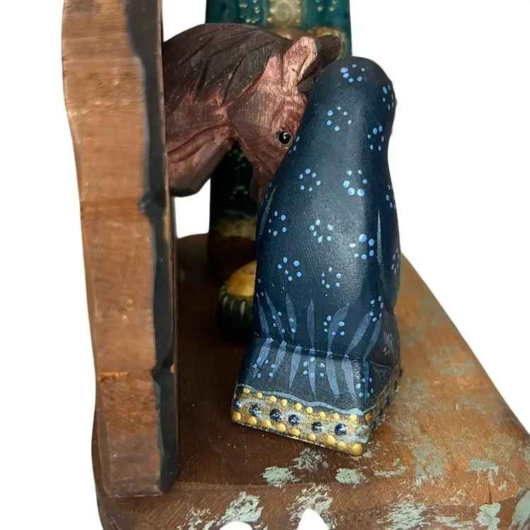This beautifully painted scene includes Mary, Joseph, baby Jesus and a gorgeous carved horse peeking in to see. Signed on back. In great condition.