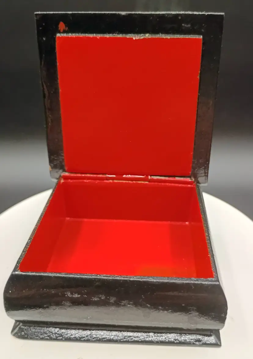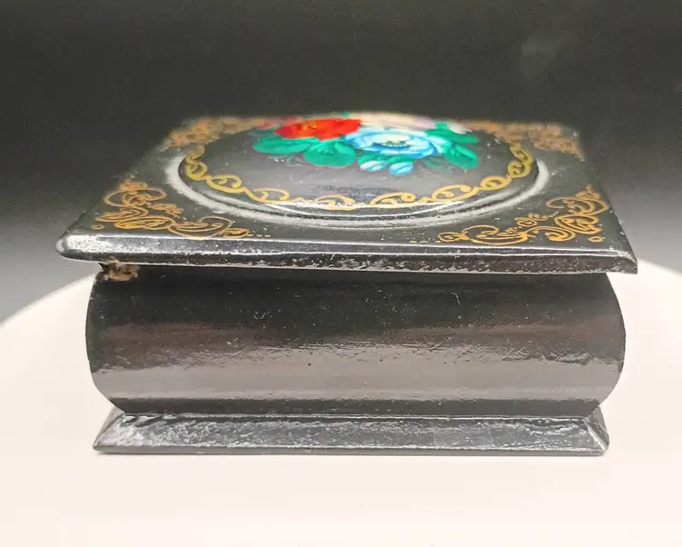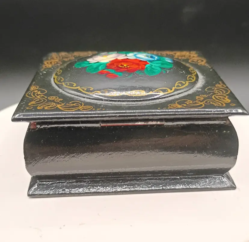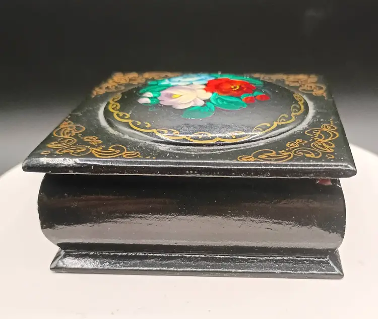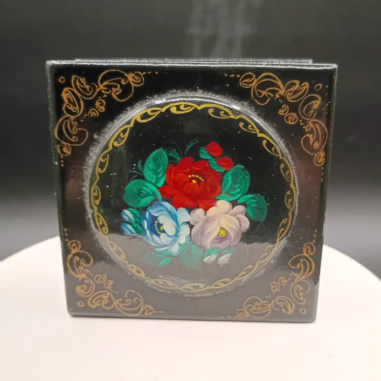 This Russian lacquer trinket box is a handmade piece featuring intricate hand-painted flowers, specifically roses, and a red interior. The hinged lid adds a touch of elegance to the box, making it a perfect collectible item for those with a love for Russian culture and craftsmanship.