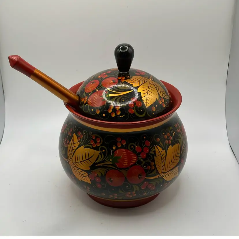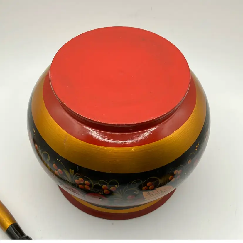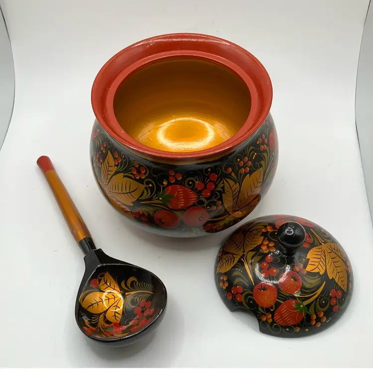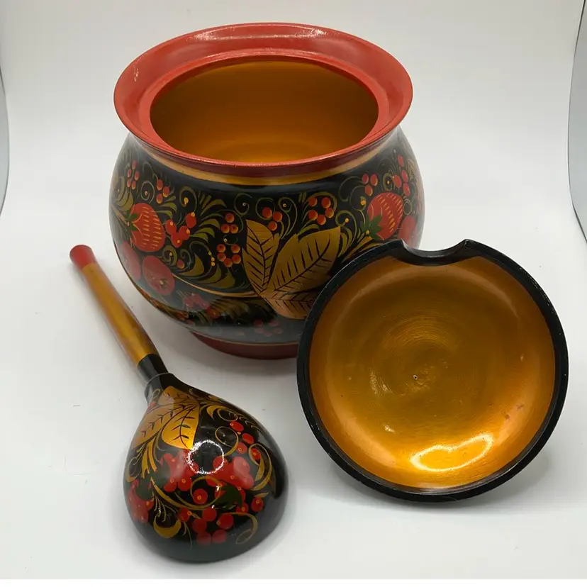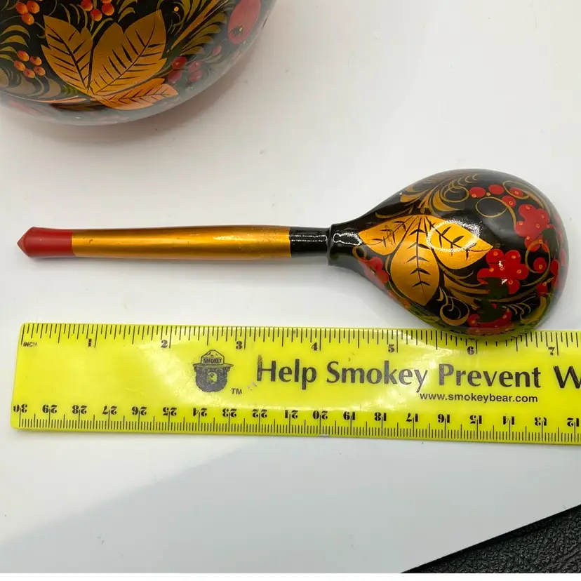 Simply stunning Russian Bowl with spoon. Good condition- some faint scratches on inside. Great colors. Bowl is approx 6” tall to top of handle- other measurements in pics.