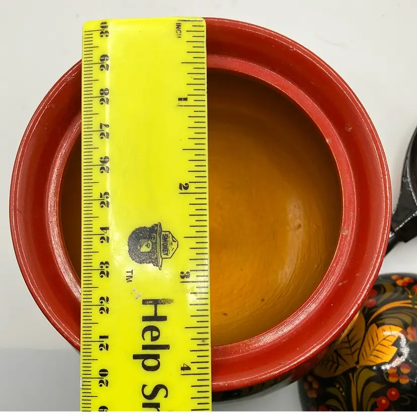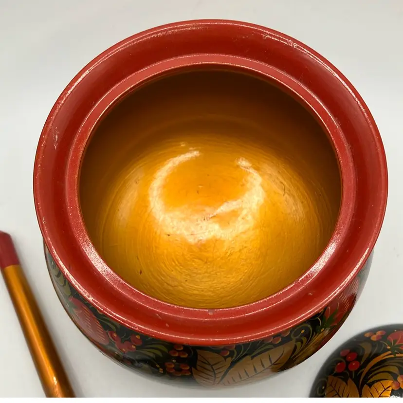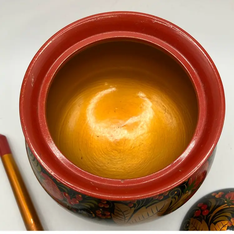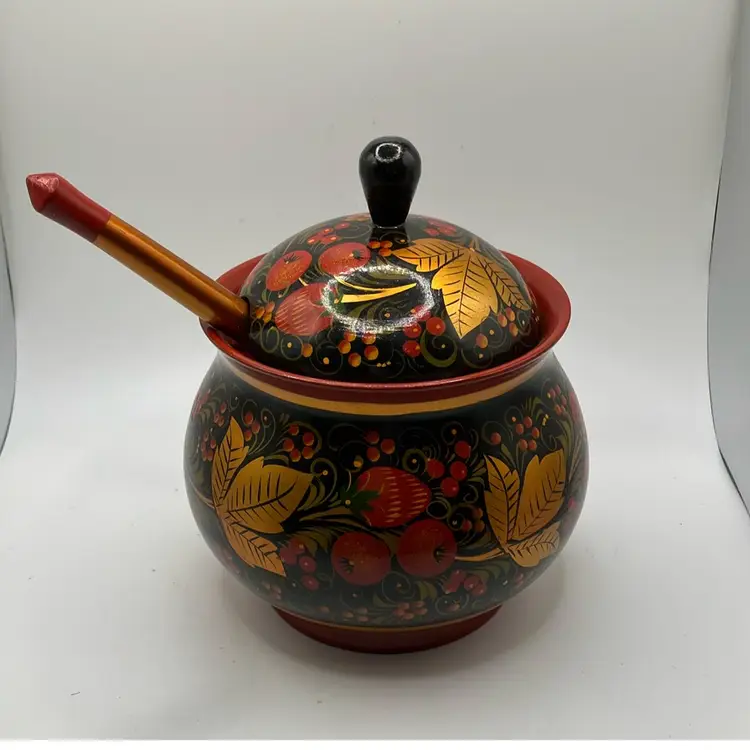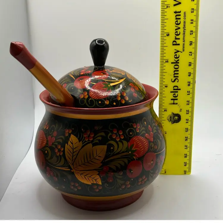 Simply stunning Russian Bowl with spoon. Good condition- some faint scratches on inside. Great colors. Bowl is approx 6” tall to top of handle- other measurements in pics.