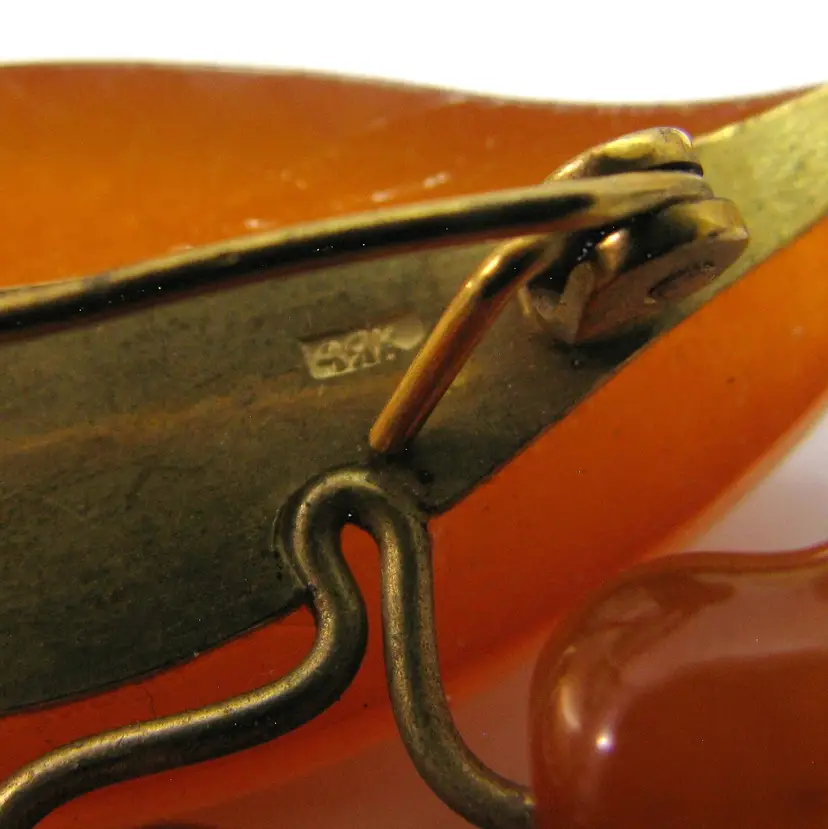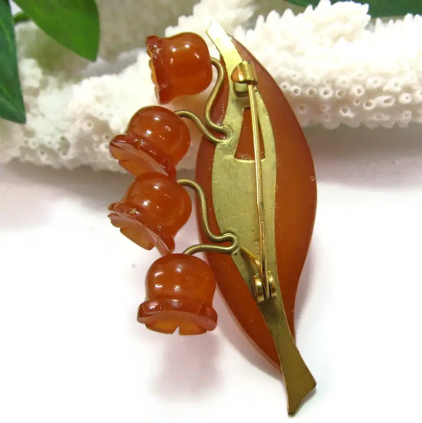 This is a wonderful amber pin featuring a gorgeous design carved lily of the valley flower.