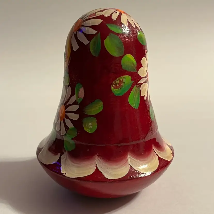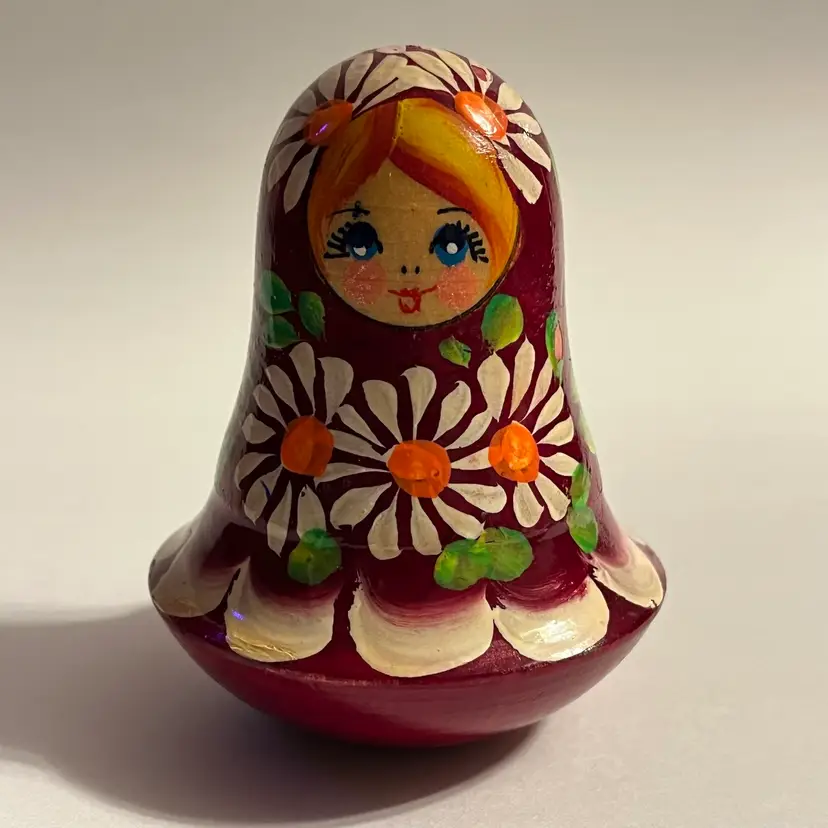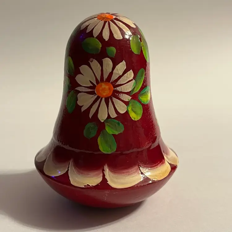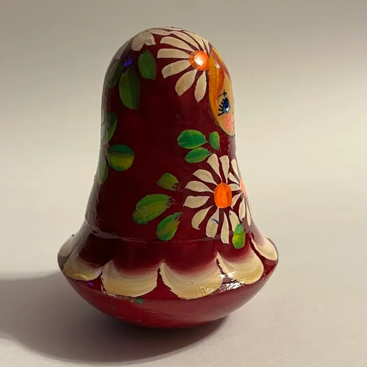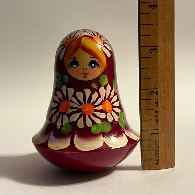 This charming vintage Russian Roly-Poly Matryoshka doll stands 3.5" tall and features a delightful wobble-and-chime design. Hand-painted with traditional folk motifs in vivid colors, it doubles as both a collectible and a nostalgic toy. Crafted from wood in the Russian Federation, it emits a gentle bell-like sound when tilted—adding whimsy to any shelf or curio cabinet. Very good vintage condition with minimal wear; please see photos for details. A lovely gift or addition to any Matryoshka or cultural collectibles collection.