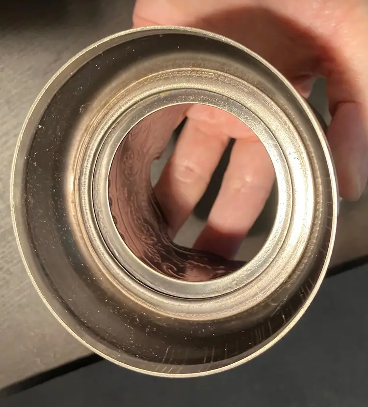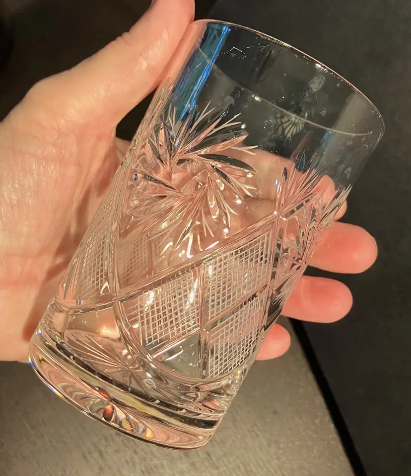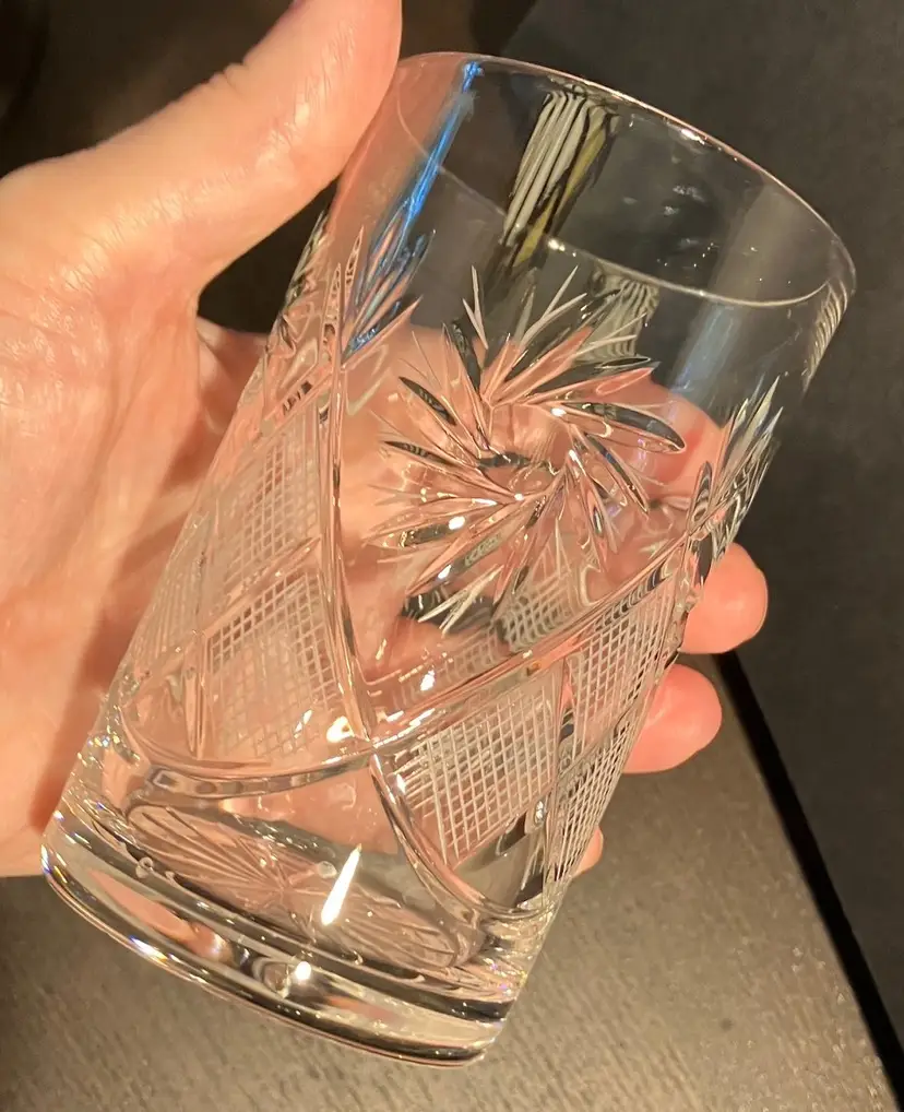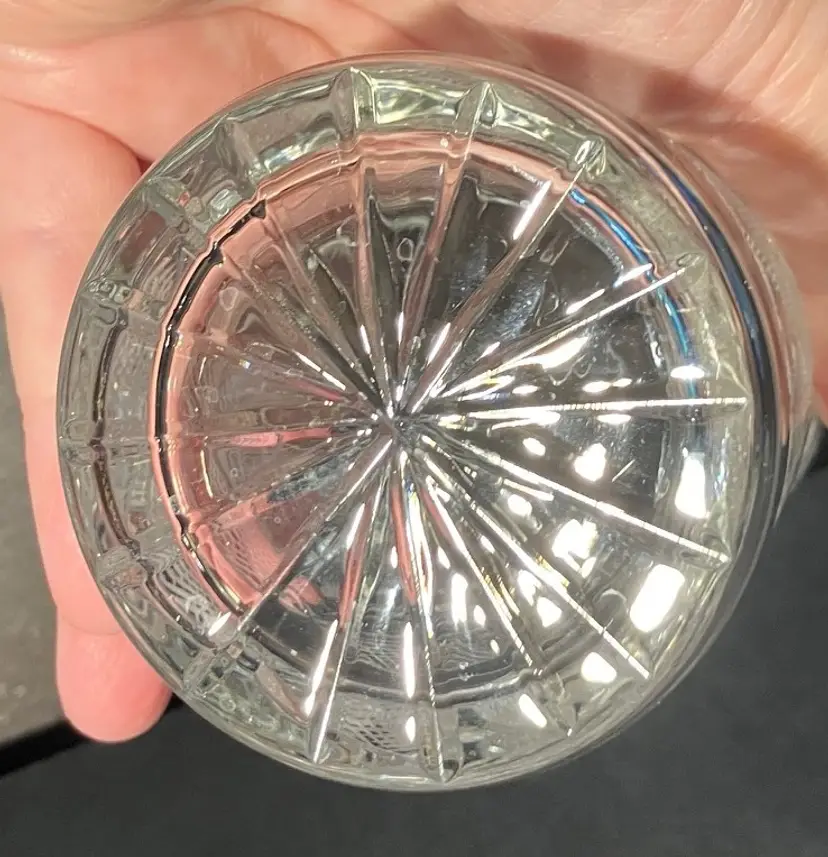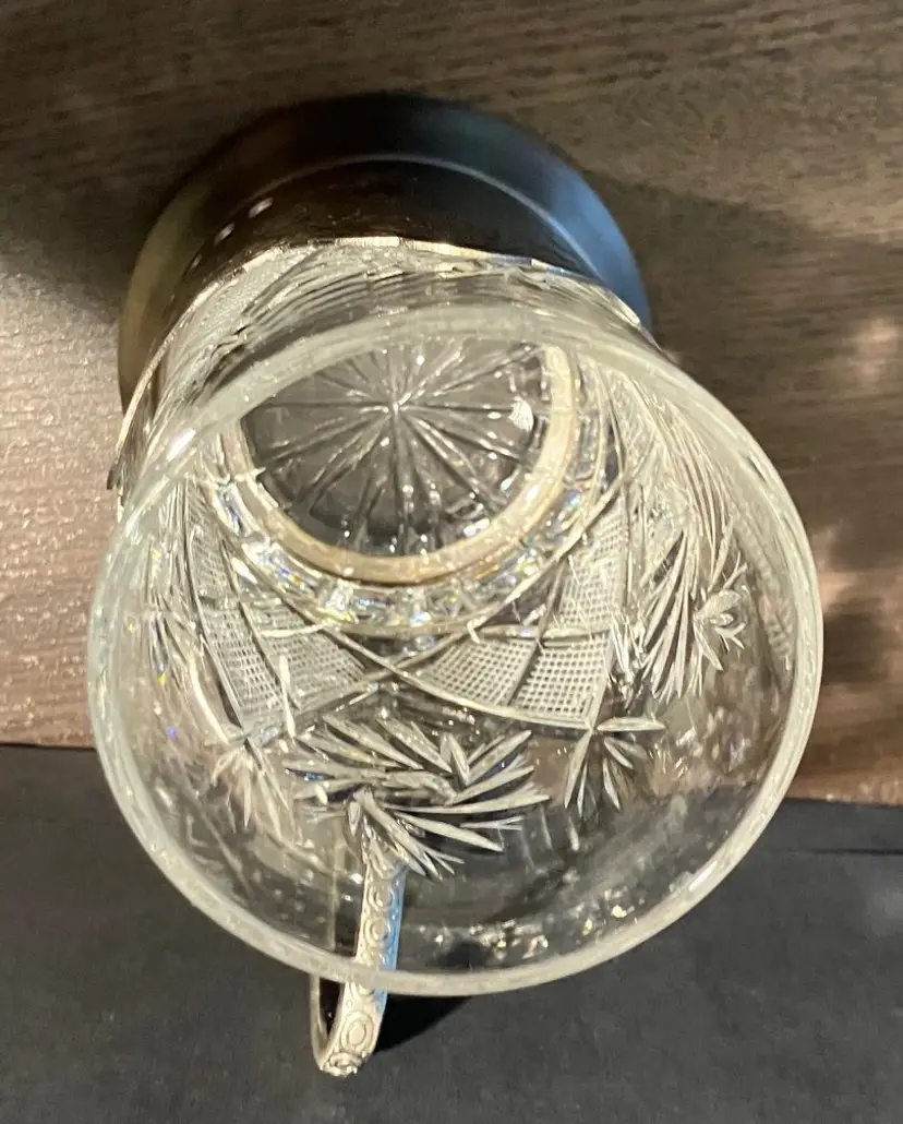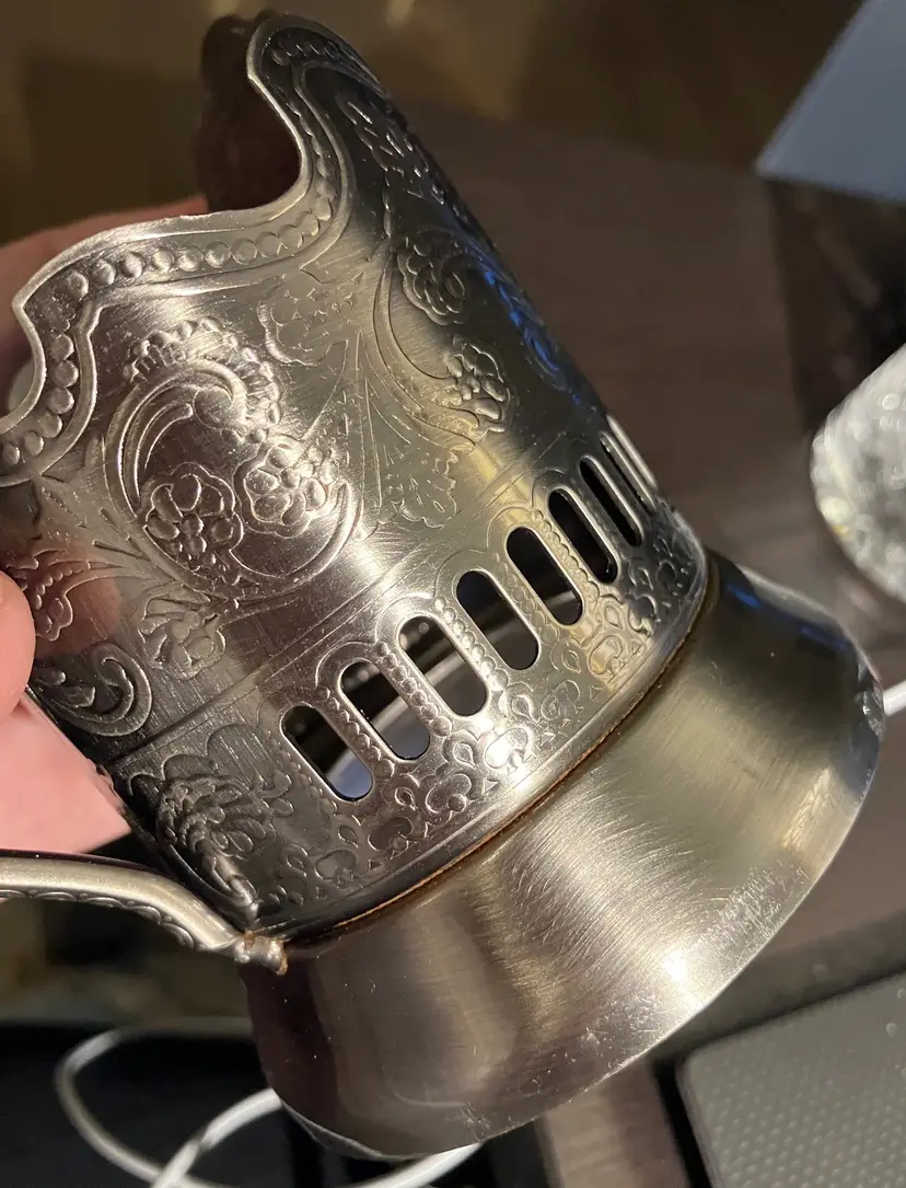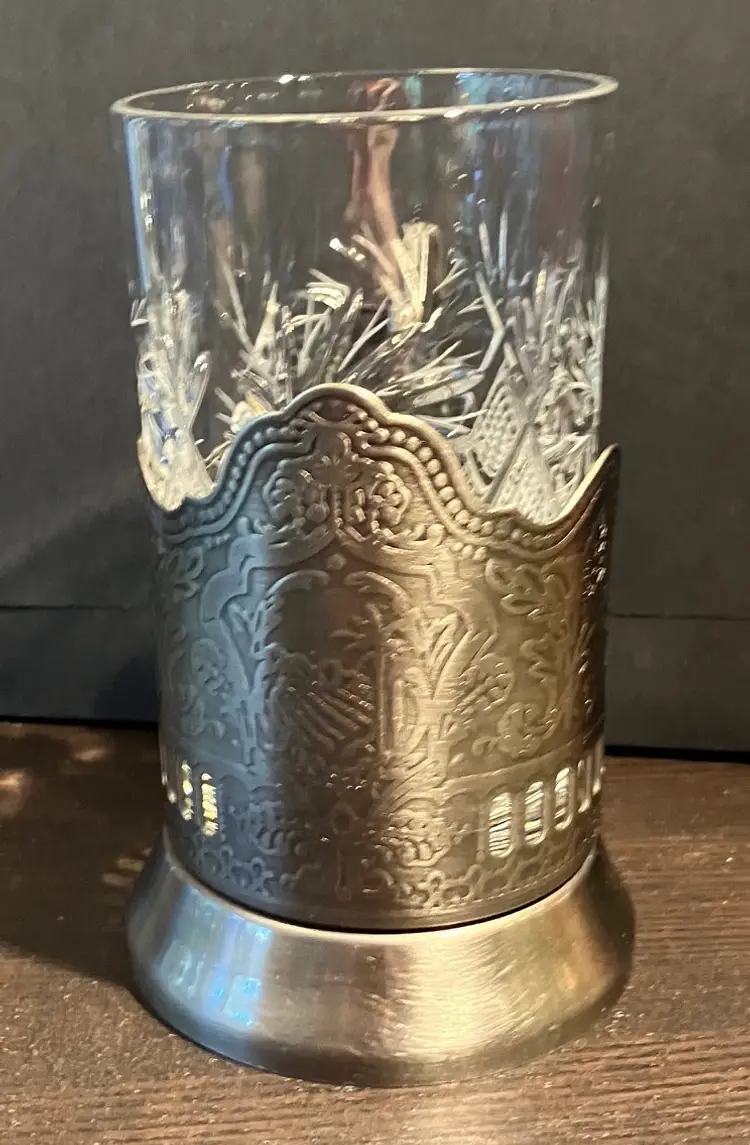 Bottom is made of stainless steel with a glass cup. The only condition issue is rust in the seam at the base of the stainless steel holder (see the last image). This type of glass was traditionally used during travel in railroad cars for tea drinking so as not to hold the hot glass with your bare hands. Unmarked. Age unknown. Weighs 1 lb. Dimensions: 5 1/4" tall with glass in the steel holder. Glass is 4 1/4" tall and 2 3/4" in diameter. The holder is 4" wide including the handle and 2 3/4" without the handle.