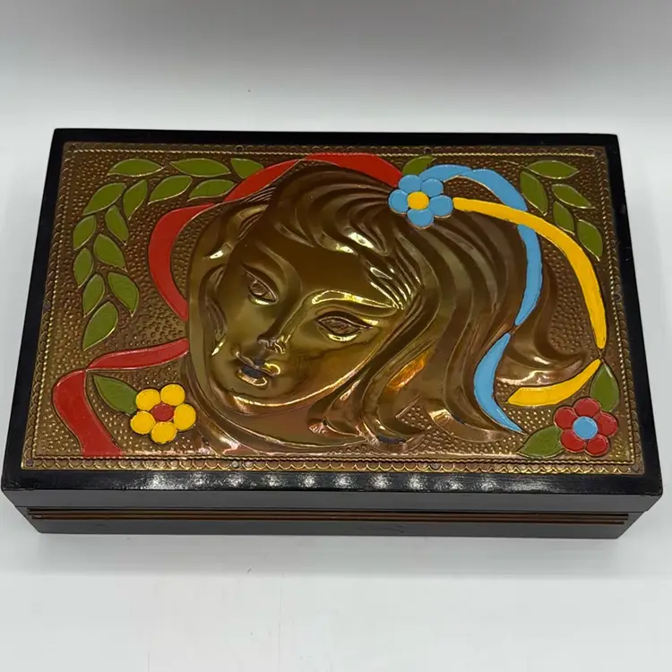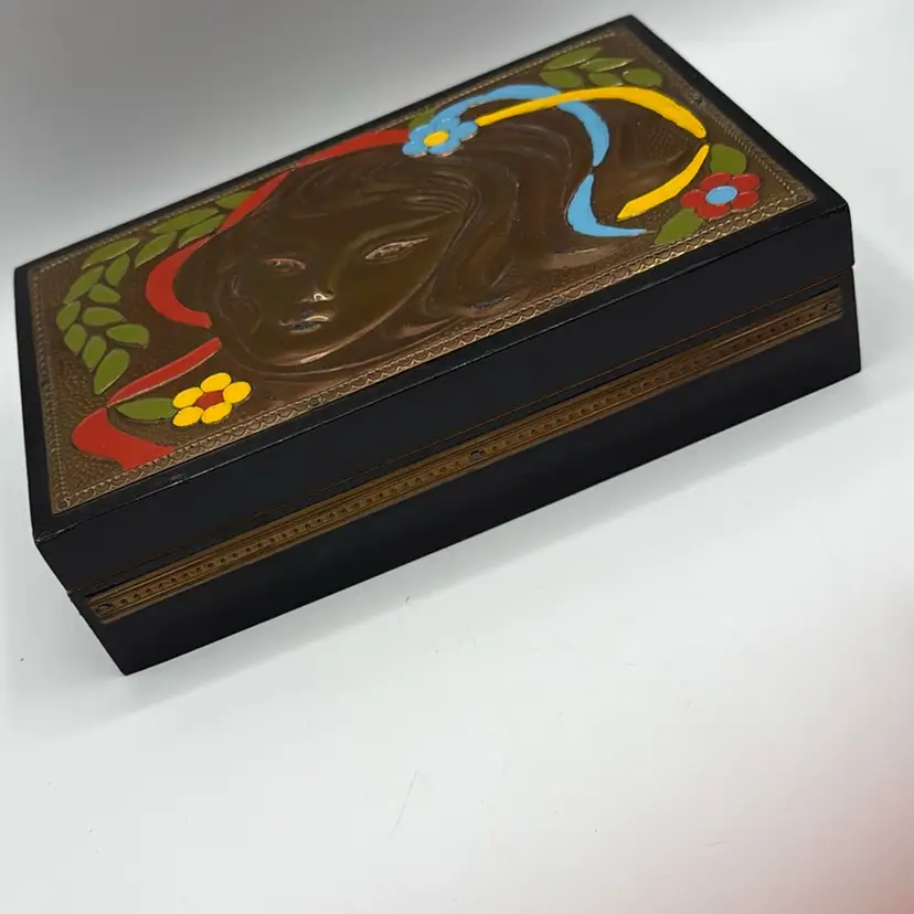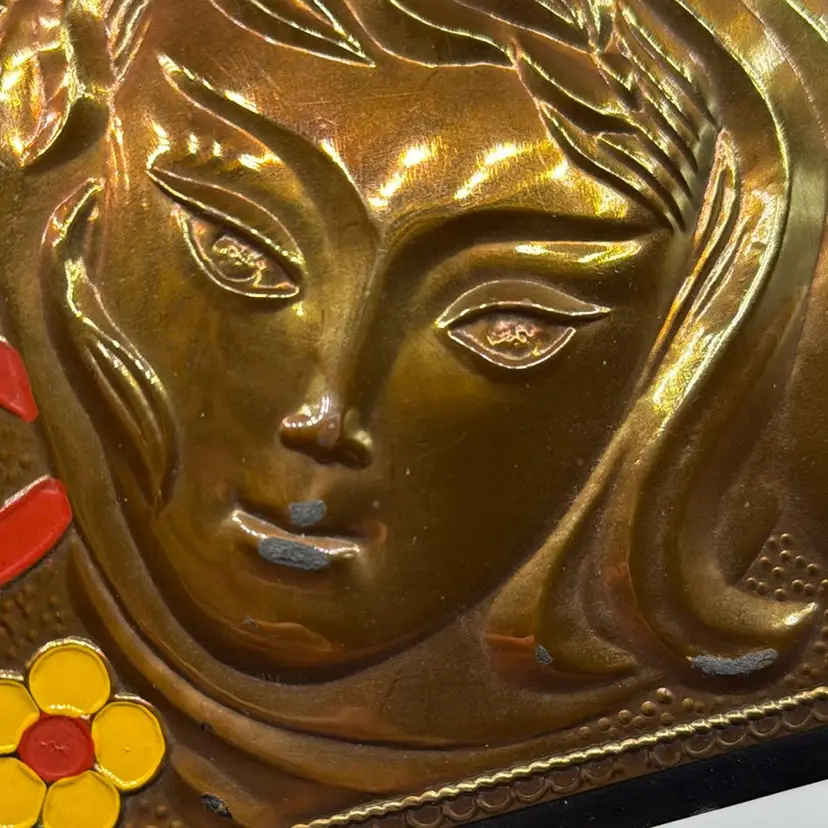 9 1/2” x 6 1/2” Girl has some paint loss on metal. Also note stain on felt inside