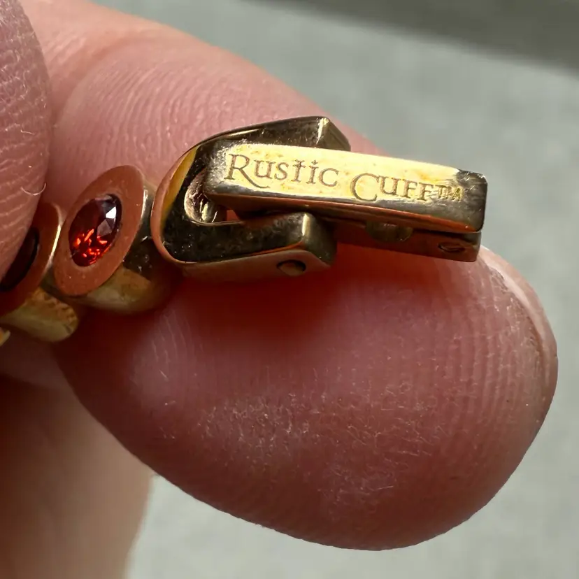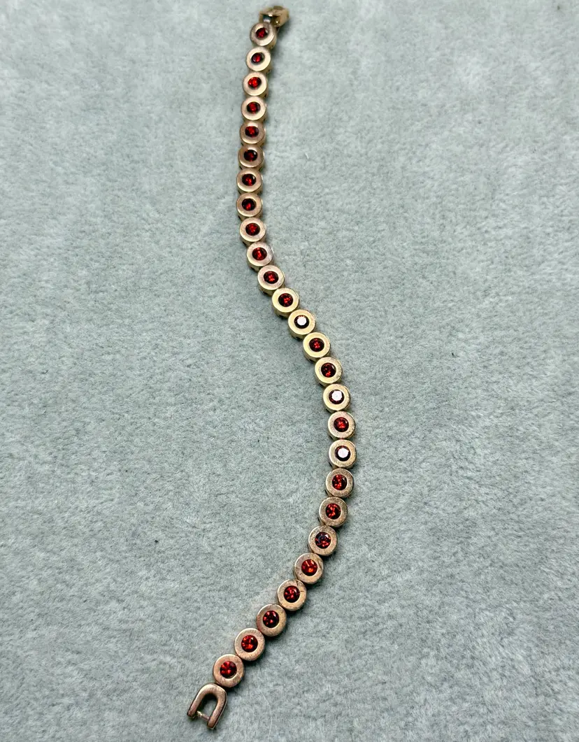 Rustic Cuff 7" Brass Copper Rose Gold Tone Tennis Link Bracelet Bezel Set Red Rhinestones Signed. Great condition with very light wear. No missing stones.