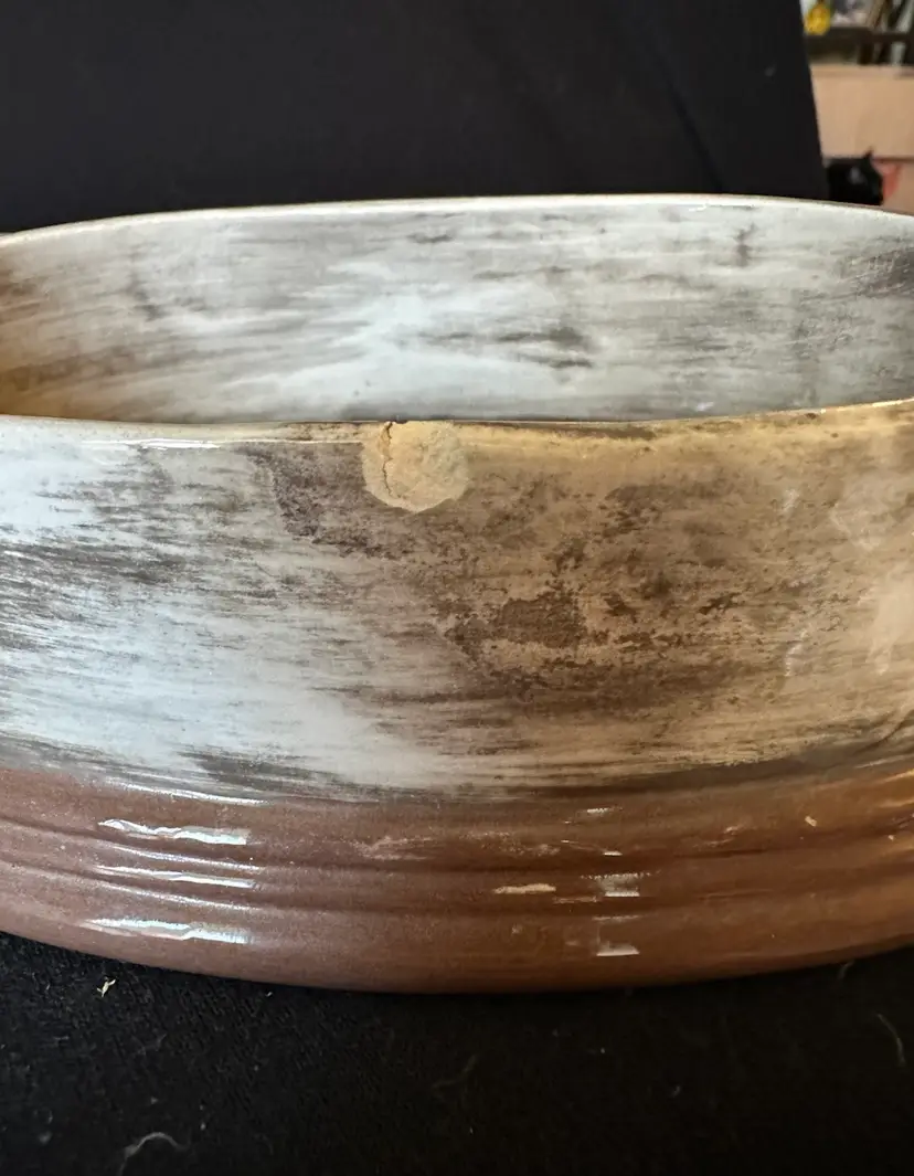 Ceramic trinket type dish with lid. Log cabin design on it. Small chip on one side as shown in last picture. 6.5 x 4.5 x 2.75 Offers welcome