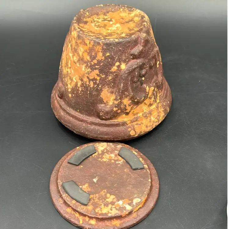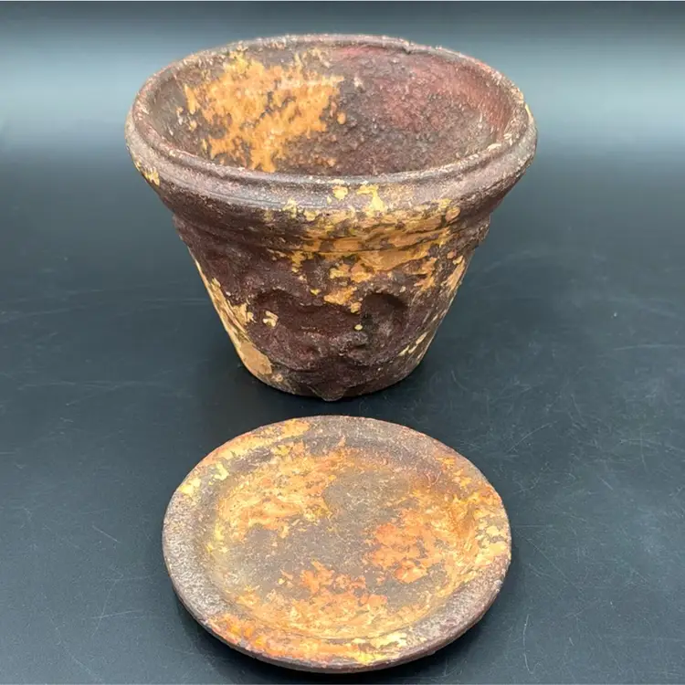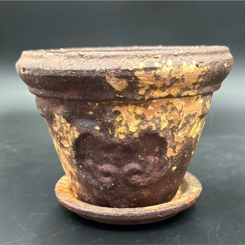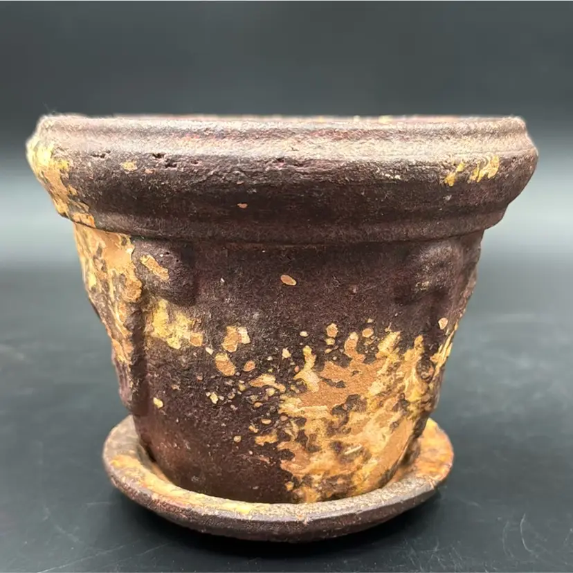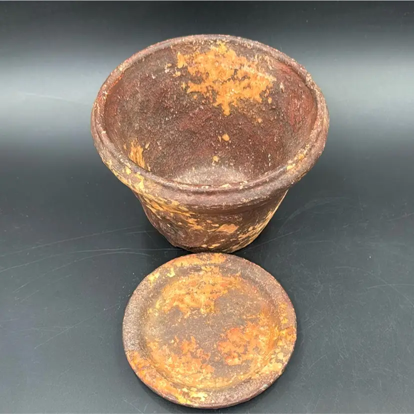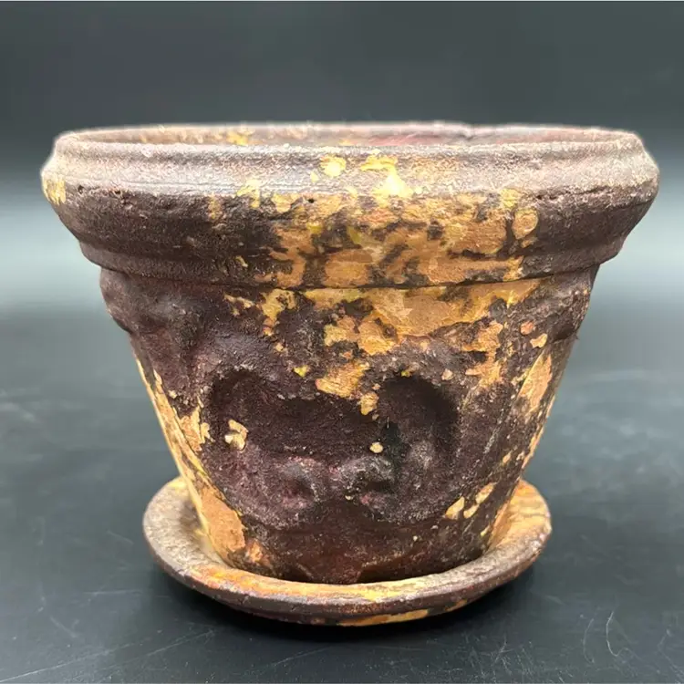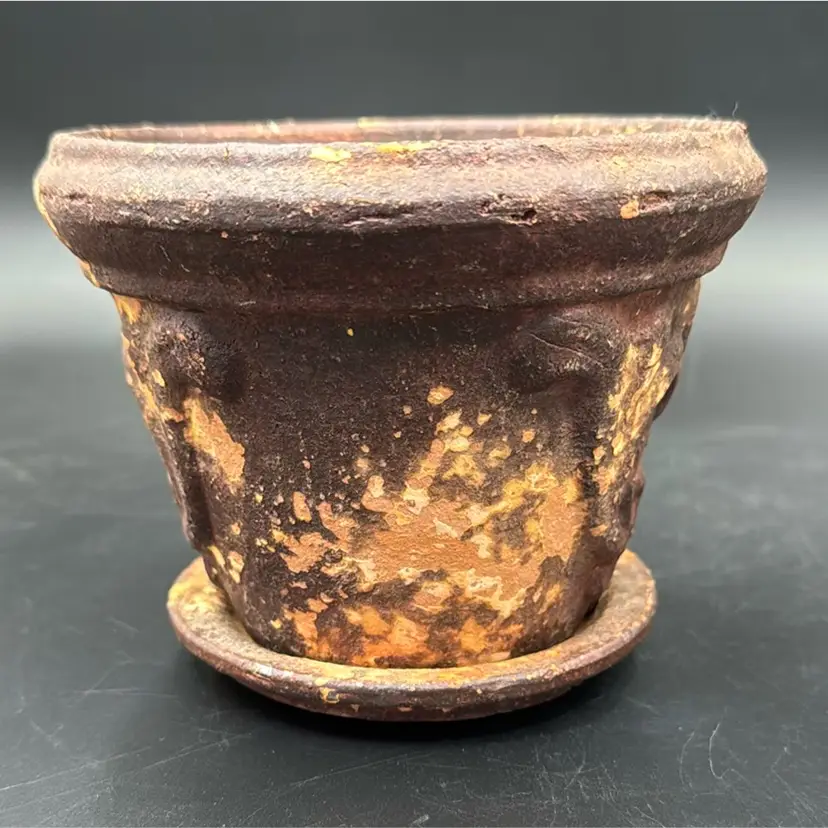 5”T 6”R no chips, cracks or brakes and wonderful rustic condition. It’s a beautiful flower pot. I have never seen one before like this one.