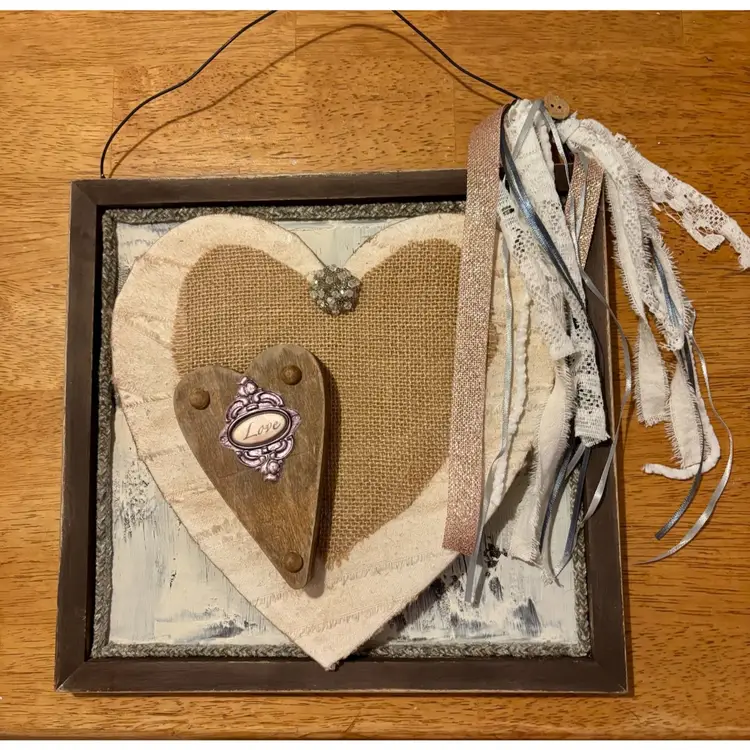 Approx. 11”x 12” Wood Burlap Ribbon Wire Linen Canvas Paint