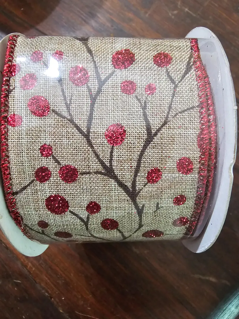 Charming rustic ribbon featuring glittery red berries on a natural burlap background. Ideal for holiday crafts, wreaths, or gift wrapping.