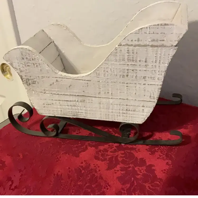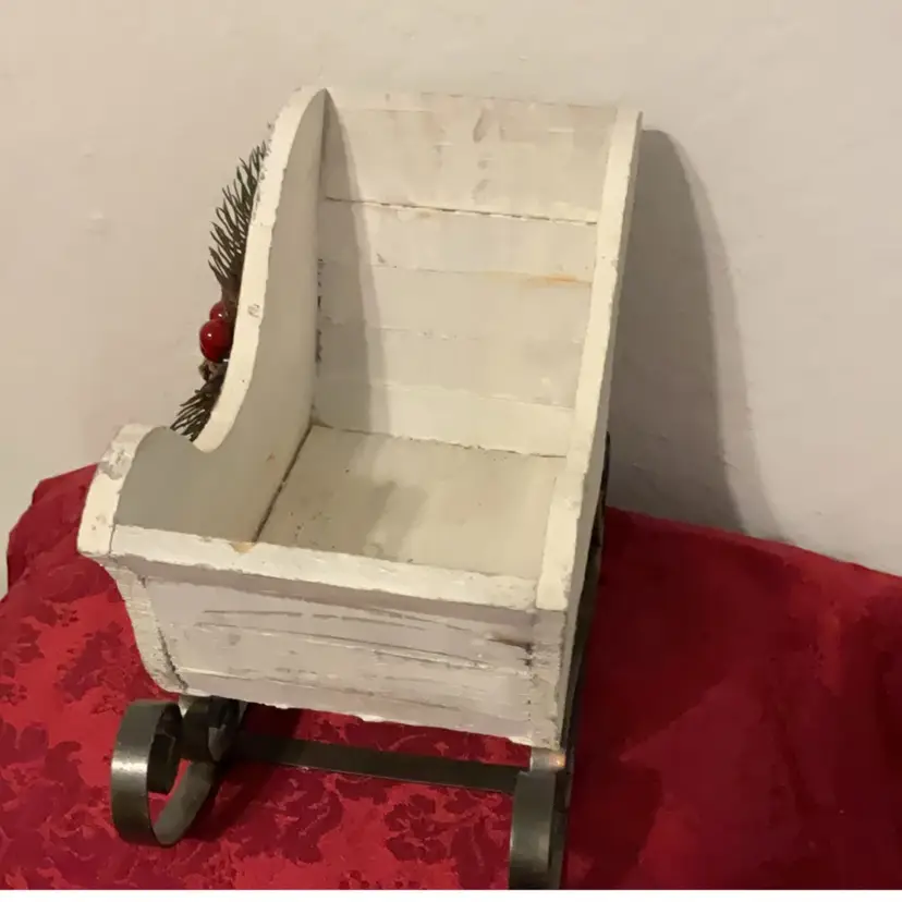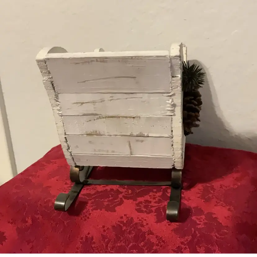 Rustic wooden sleigh with metal runner is a charming decoration that captures a perfect touch to your holiday decor. Pine leaves with cones & berry design on one side. 11”x5.5”x7.5”.