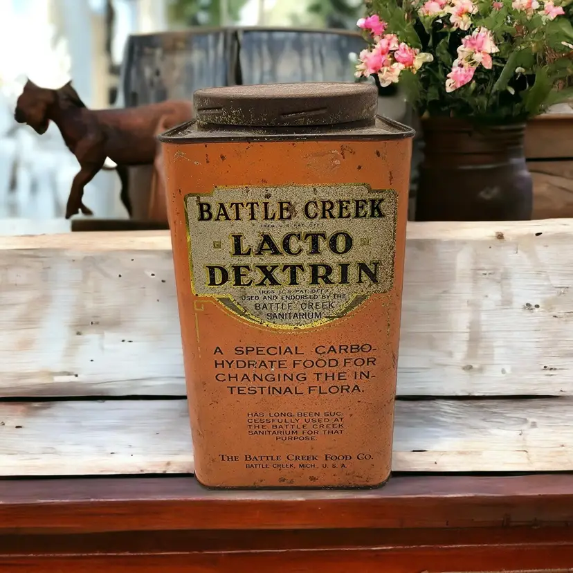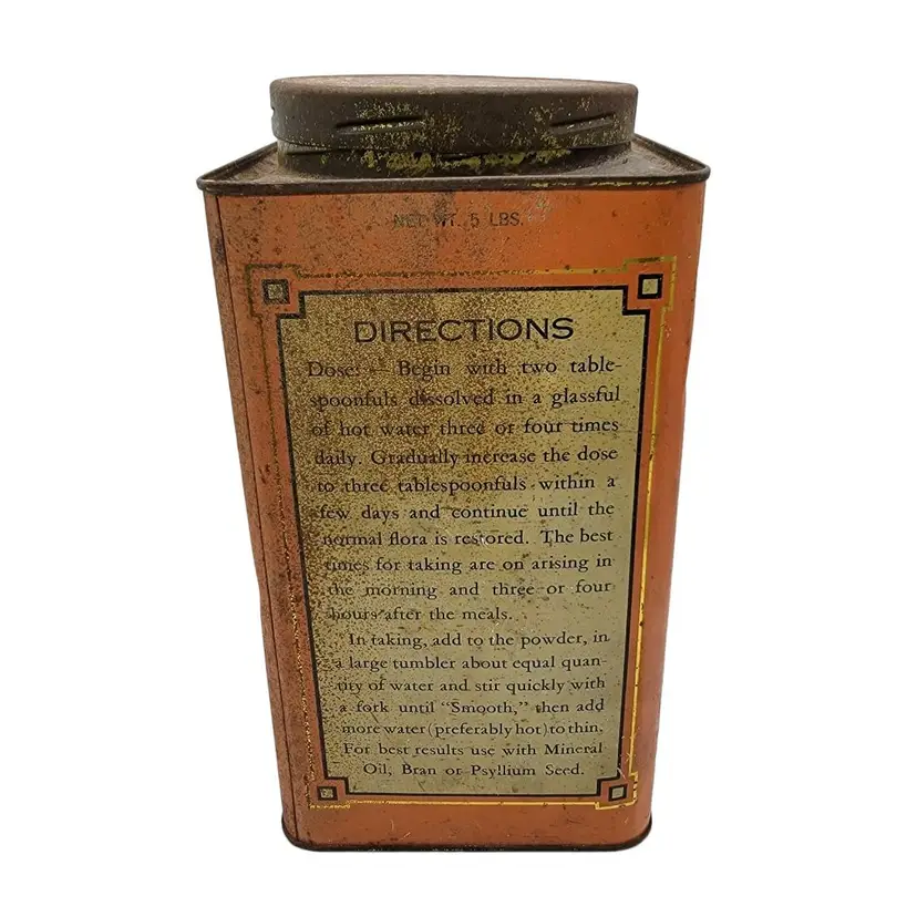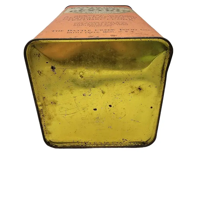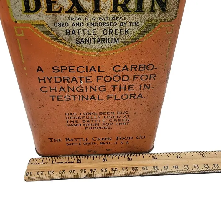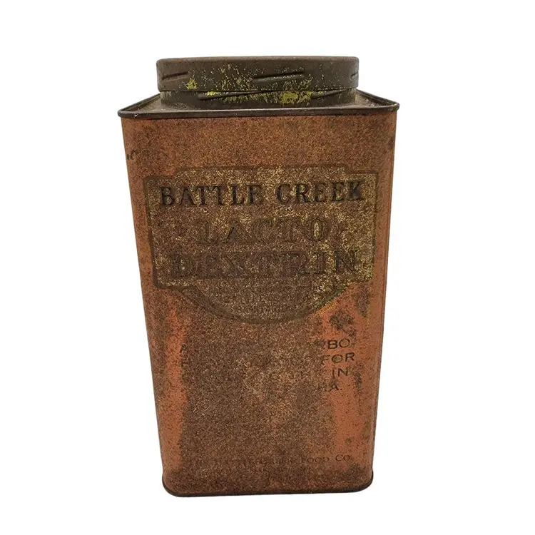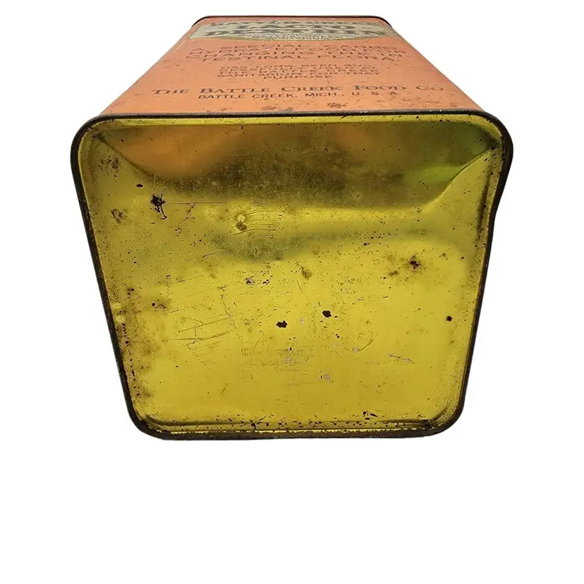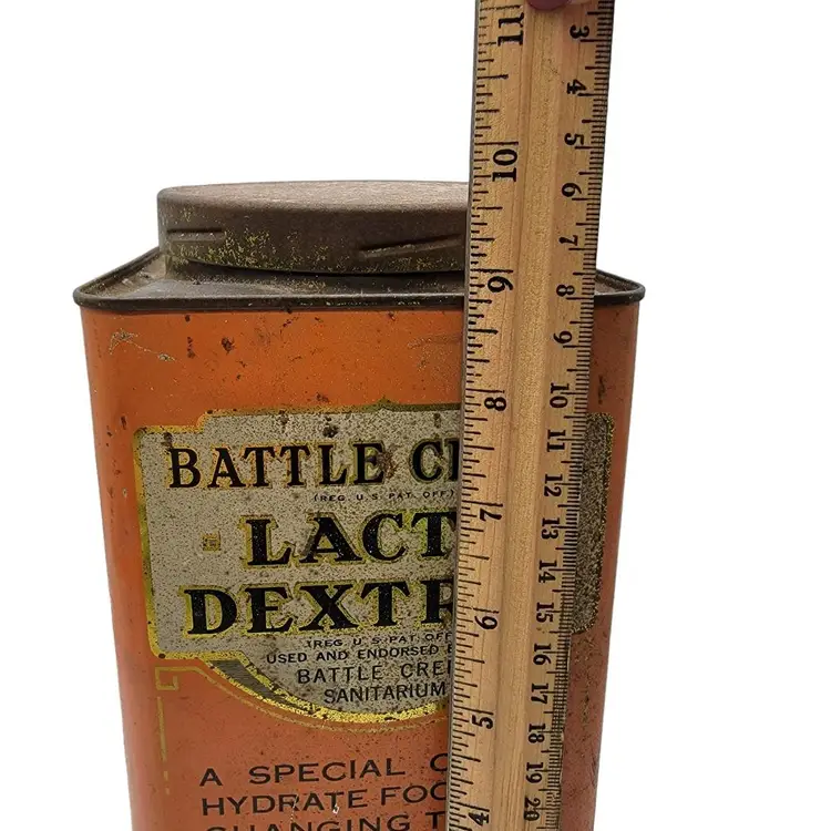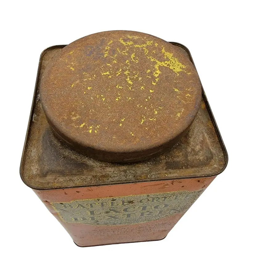 This is a rusty crusty old tin, but it's a great display piece. Condition:pre-owned; The lid does not open. Measurements approximately: 10"x5"
