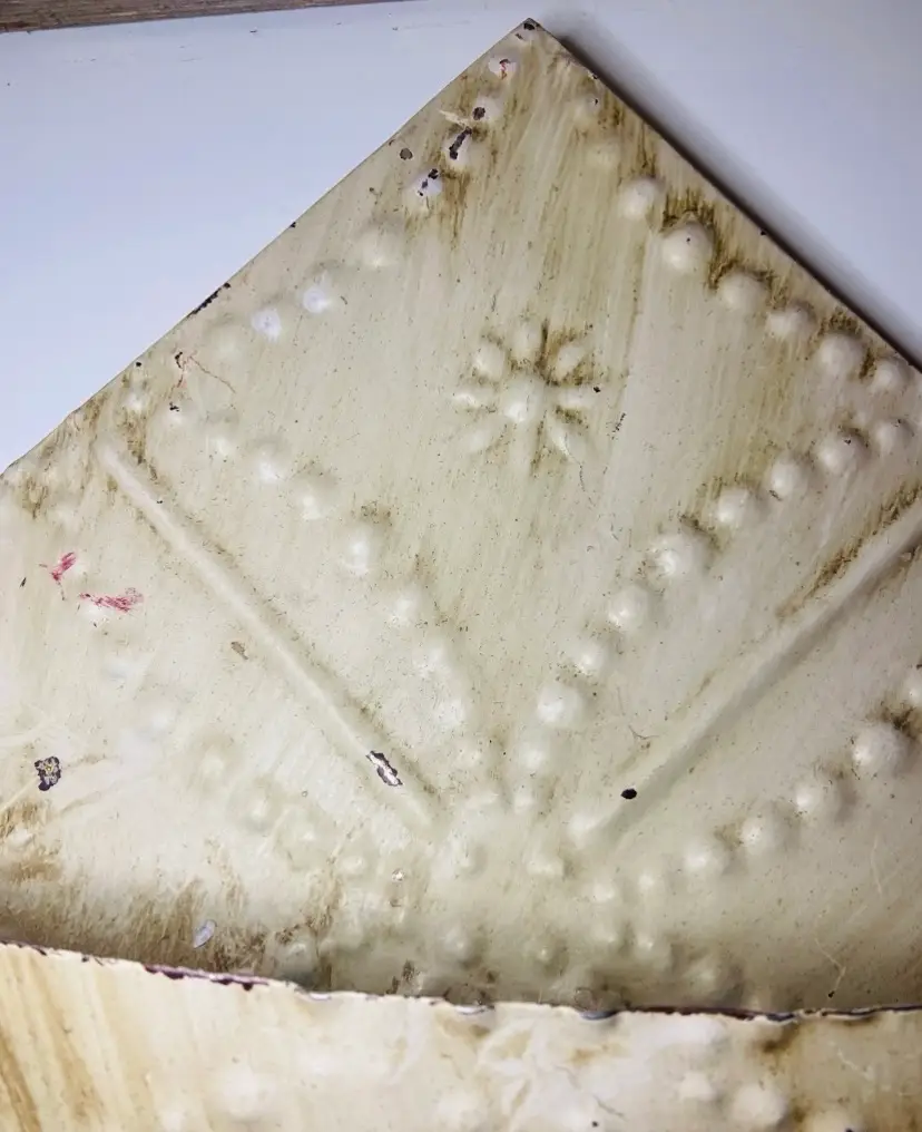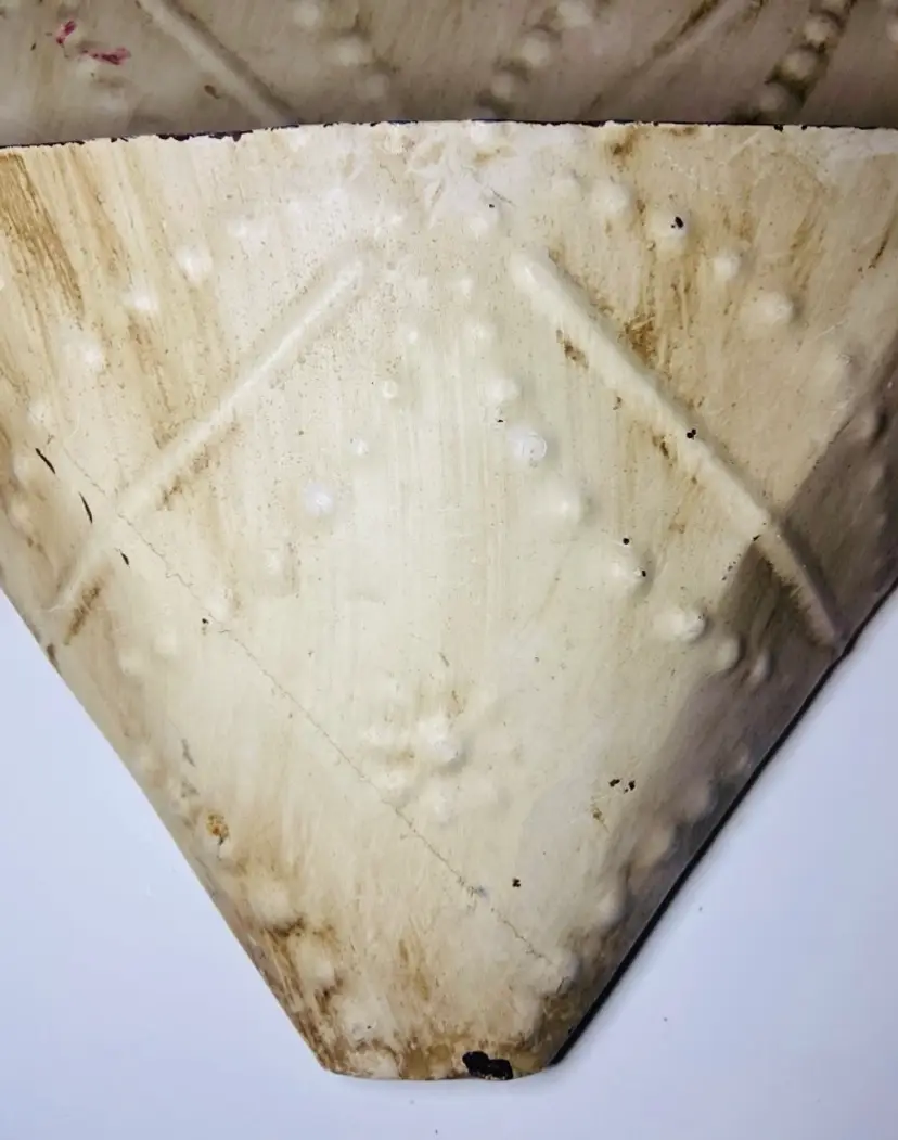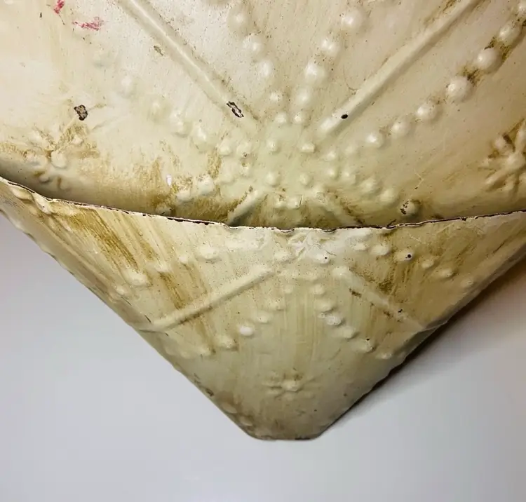 This wall pocket has a wood backing and is made from tin metal with floral and punched dot decor. It is distressed white paint and has rusty spots and is a little crusty looking. The perfect farmhouse shabby chic wall decor. There is a hanger on the back.