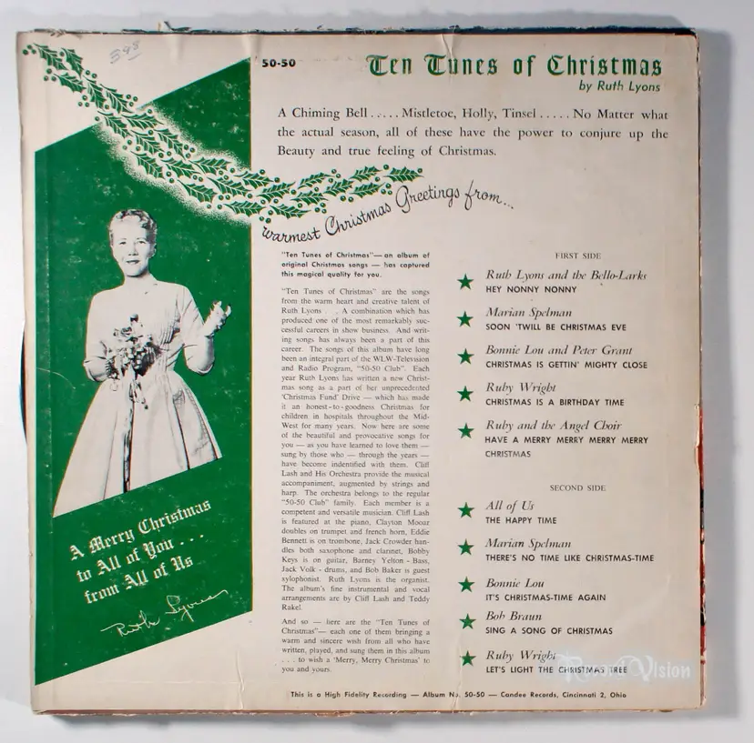 Ten Tunes of Christmas, by Ruth Lyons, released in 1958 on Candee Records, is a collection of ten original holiday songs performed by Lyons and her ensemble, including the Bello-Larks, Marian Spelman, Bonnie Lou, Peter Grant, Ruby Wright, and Bob Braun. This regional LP, primarily available in the Cincinnati area where Lyons' television show was broadcast, achieved remarkable success, selling 250,000 copies—a significant feat compared to the national benchmark of 50,000 copies for a hit album. Lyons, a pioneering radio and television personality, wrote all the songs and produced the album, a rare accomplishment for a woman in the 1950s music industry, with recordings made at King Recording Studio in Cincinnati. Notable tracks include Let's Light the Christmas Tree by Ruby Wright and Have a Merry Merry Merry Merry Christmas by Ruby Wright and the Angel Choir, though no specific singles from the album were identified as chart-topping hits. The album's cultural impact and Lyons' contributions to holiday music and philanthropy through her Christmas Fund underscore its historical significance in the Cincinnati region.