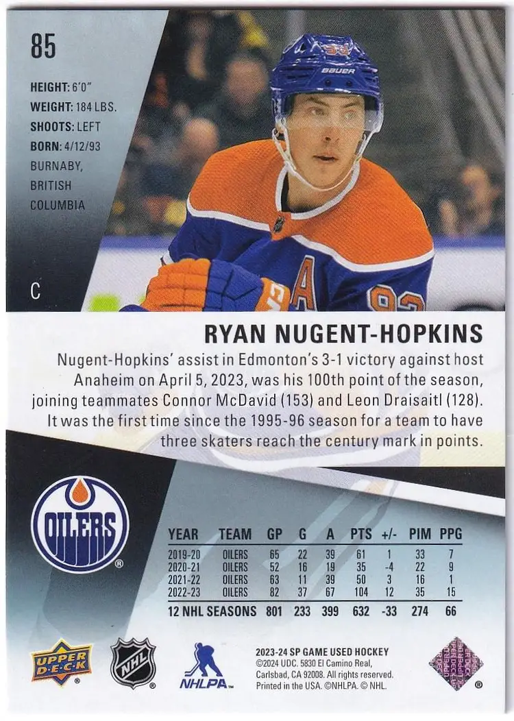 2023-24 SP Game Used #85 Ryan Nugent-Hopkins Edmonton Oilers Print Run - 93