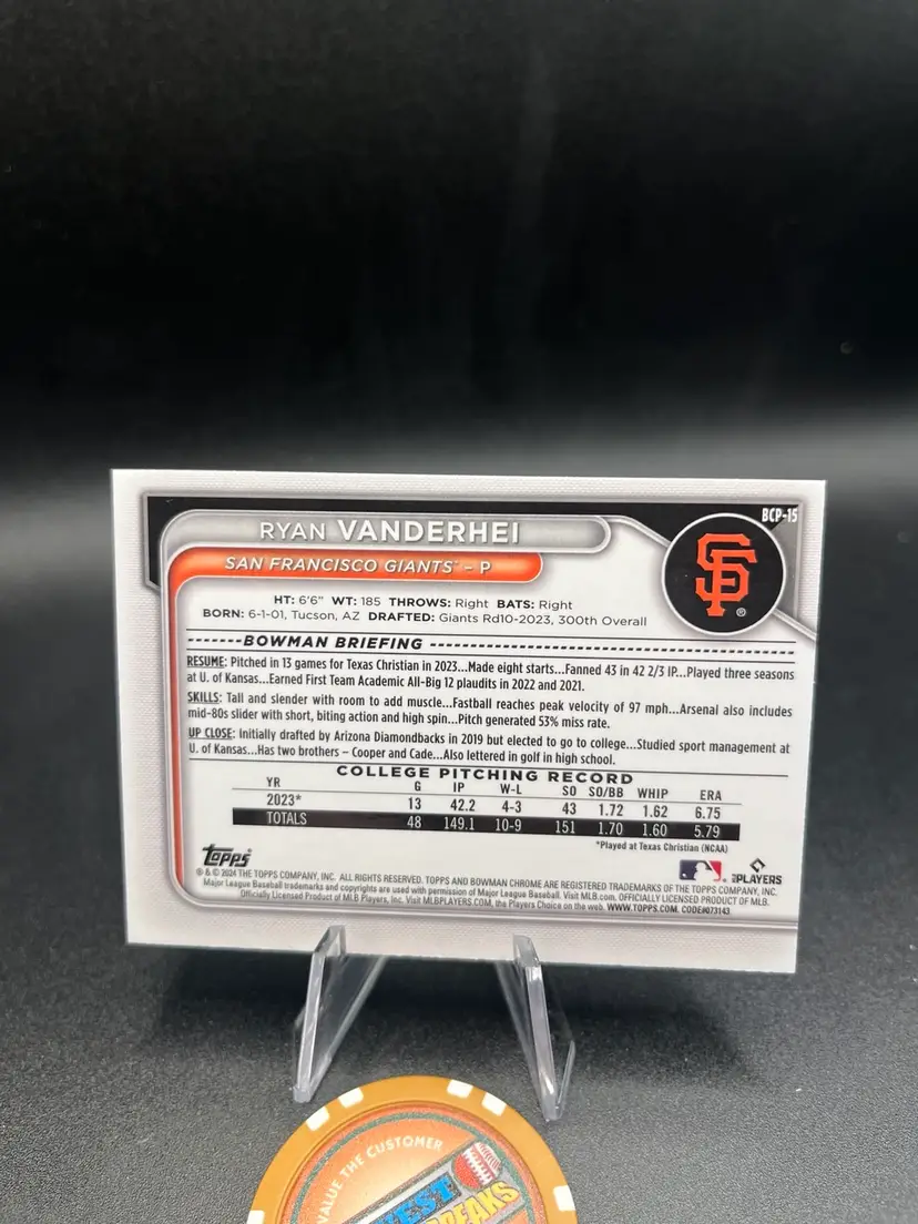2024 Bowman #49/199 Ryan Vanderhei 1st Bowman Chrome. San Francisco Giants.