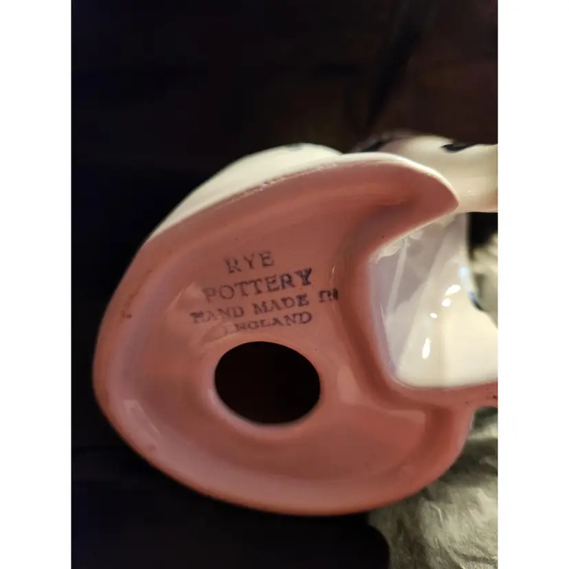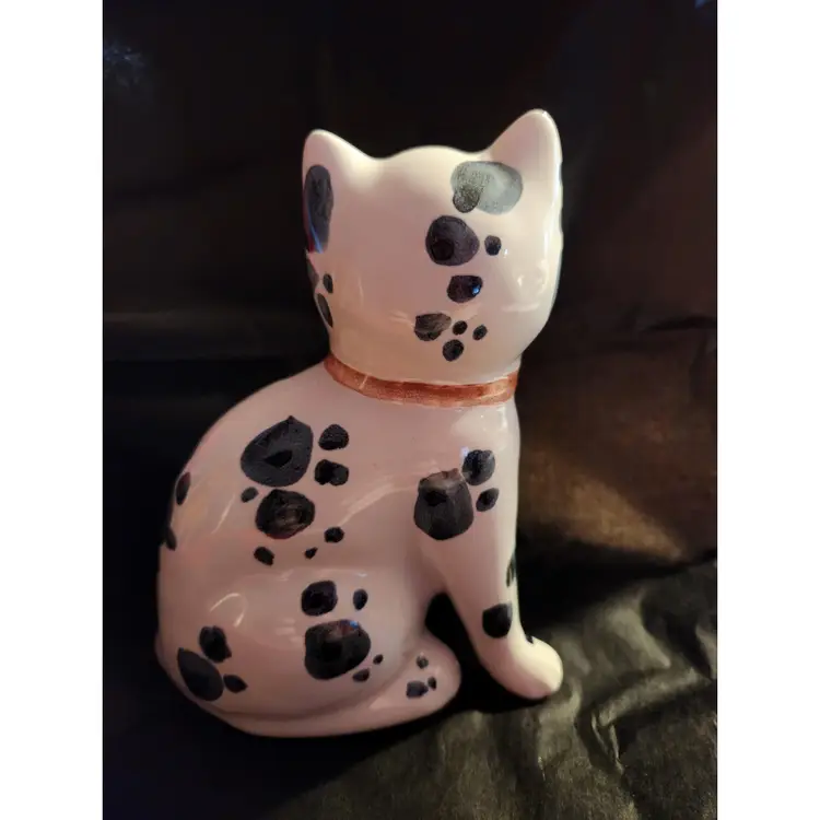 Rye Pottery Spotted Ceramic Cat Handmade in England Stands approximately 6 inches tall White cat with blue spots and pink bow In excellent condition - no chips or crackws