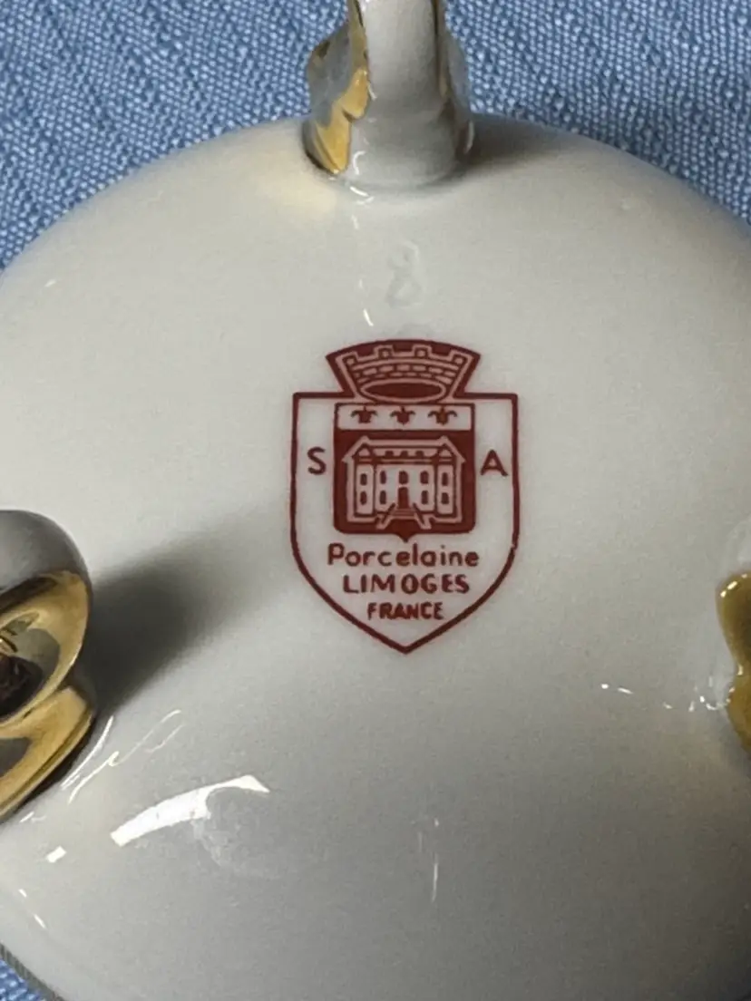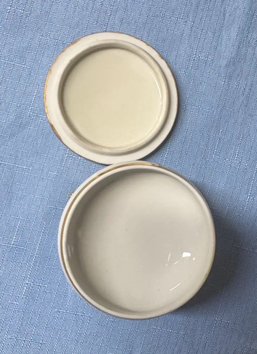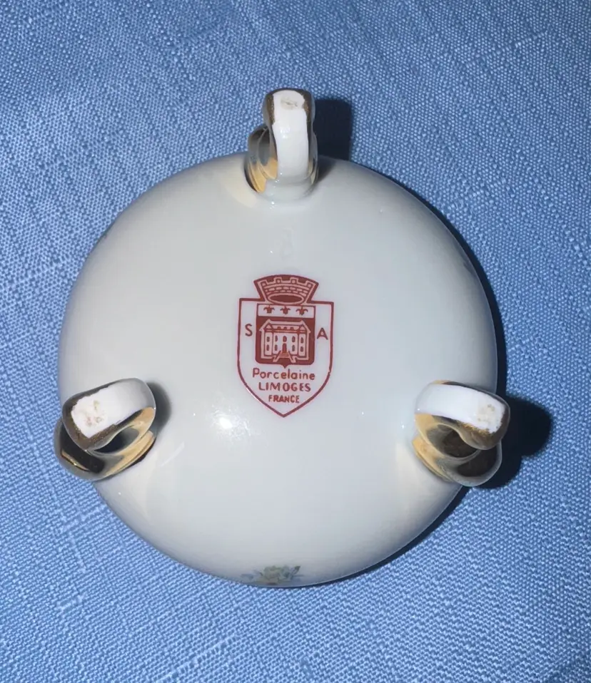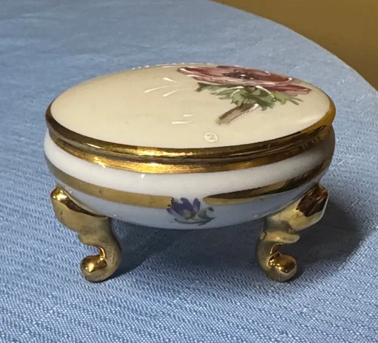Elegant trinket box featuring a floral design and gold accents. Perfect for small keepsakes. VTG S A Limoges France Porcelain White, Cream w/Gold Trim Round Trinket Ring Footed Box Hand painted flower on cream top 3 footed white bottom Excellent condition with no breaks or chips (2082242610)