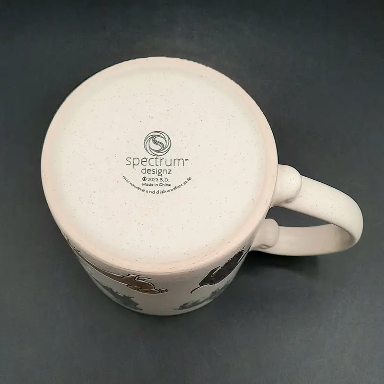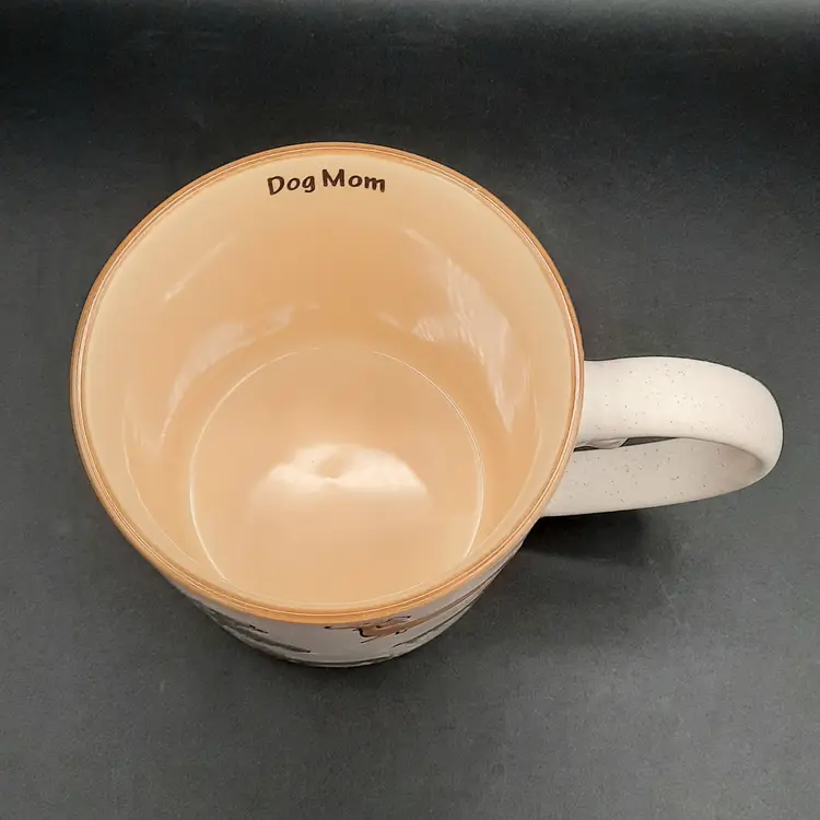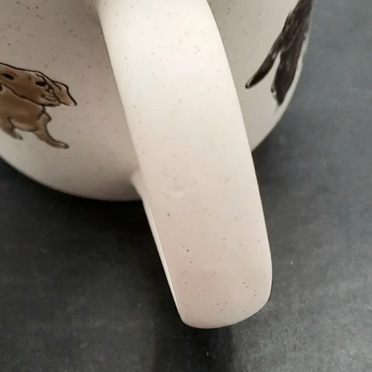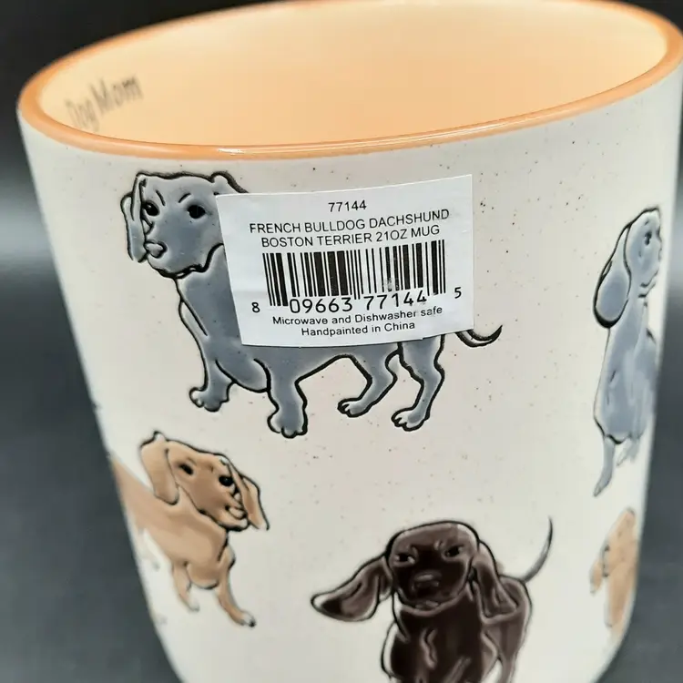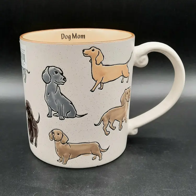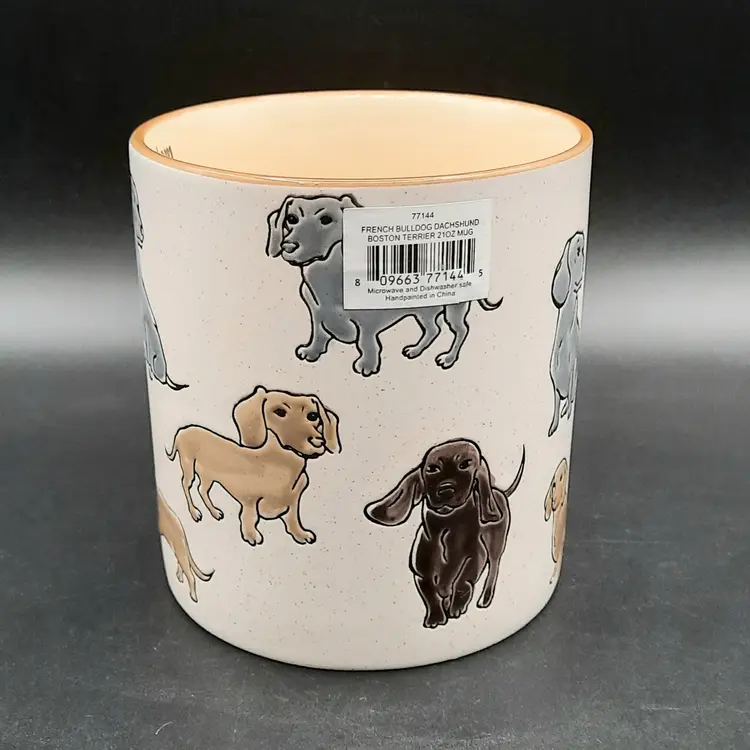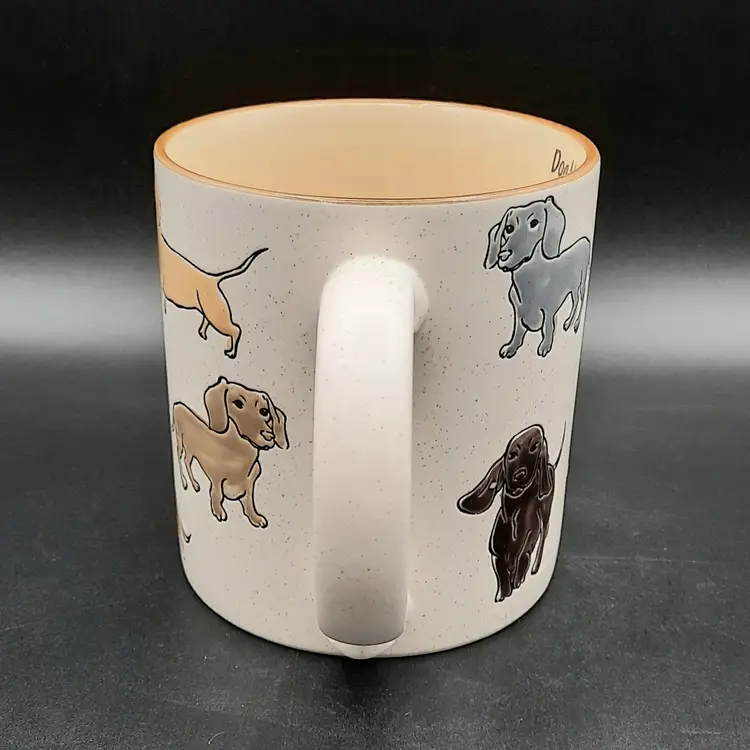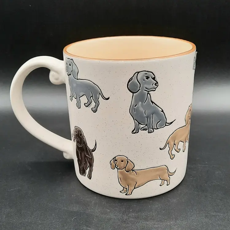 Adorable dachshund mug is 4 1/2"H x 4"W at rim, excellent condition with original label, small depression in handle that is a mfg flaw