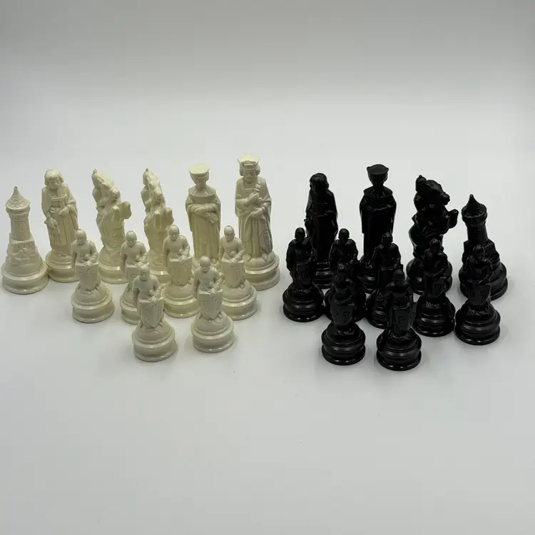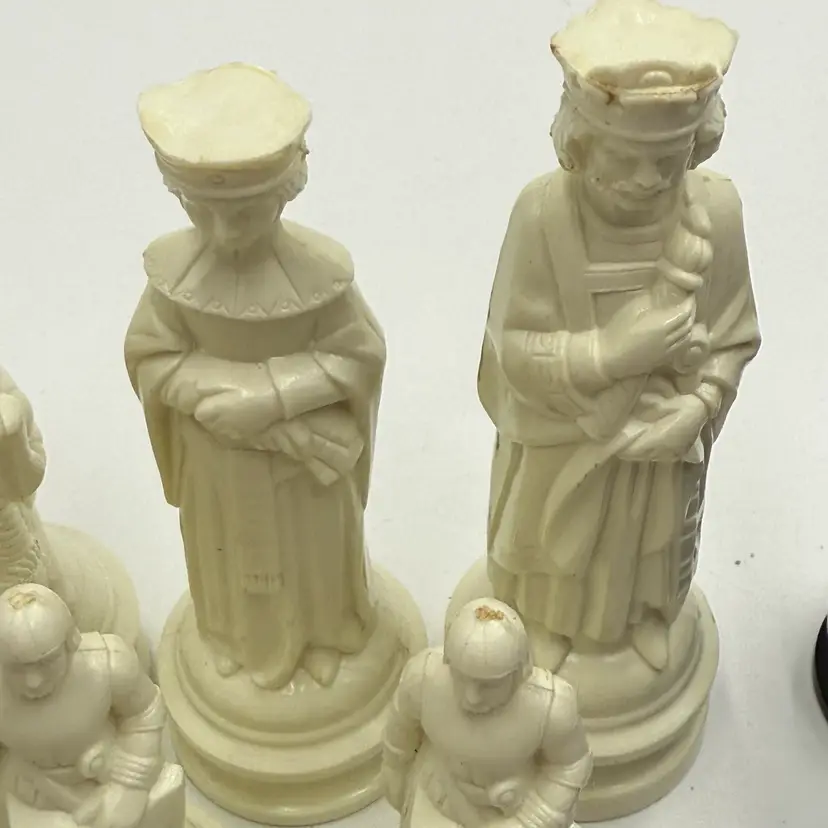 Incomplete set of 23 pieces In good condition. The white king has a little bit of a stain on the crown. The black knight is missing the felt bottom.