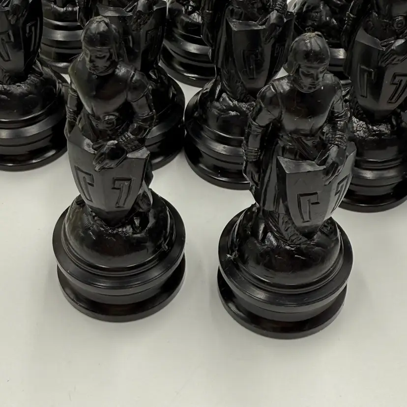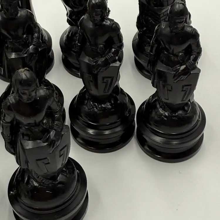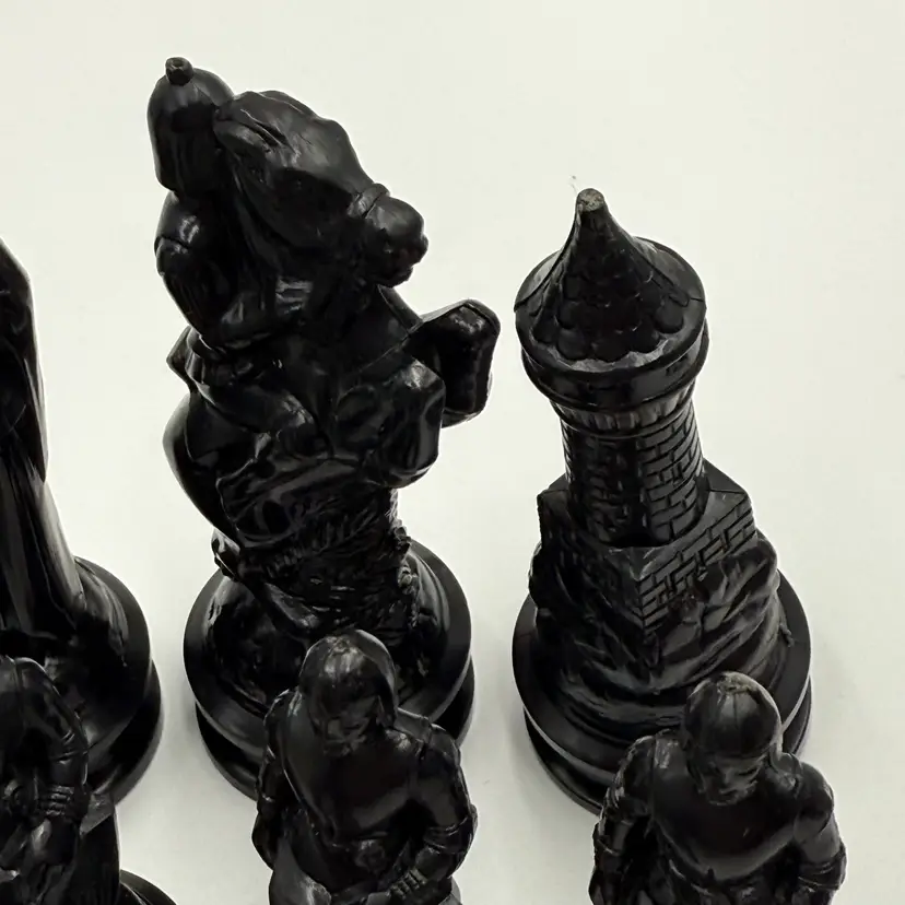 The black set consists of: 7 pawns 1 knight 1 rook 1 Queen 1 bishop.