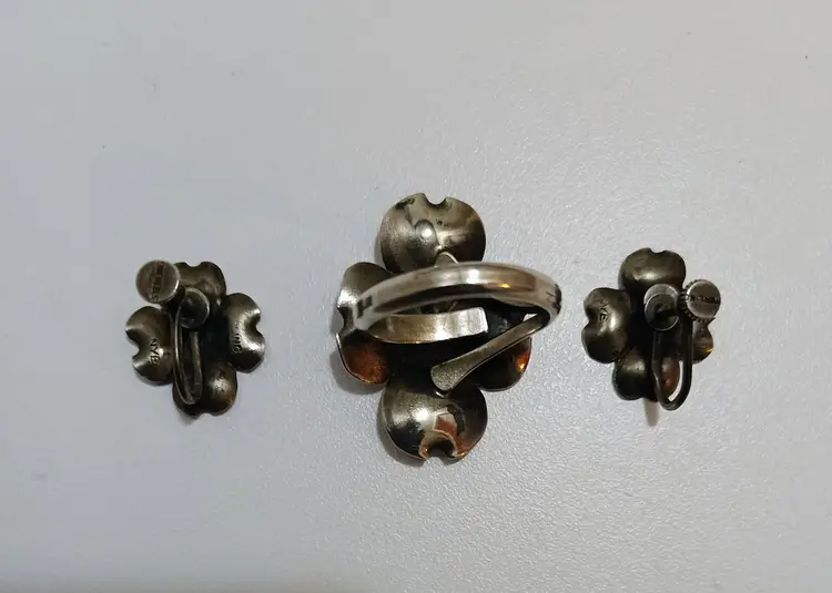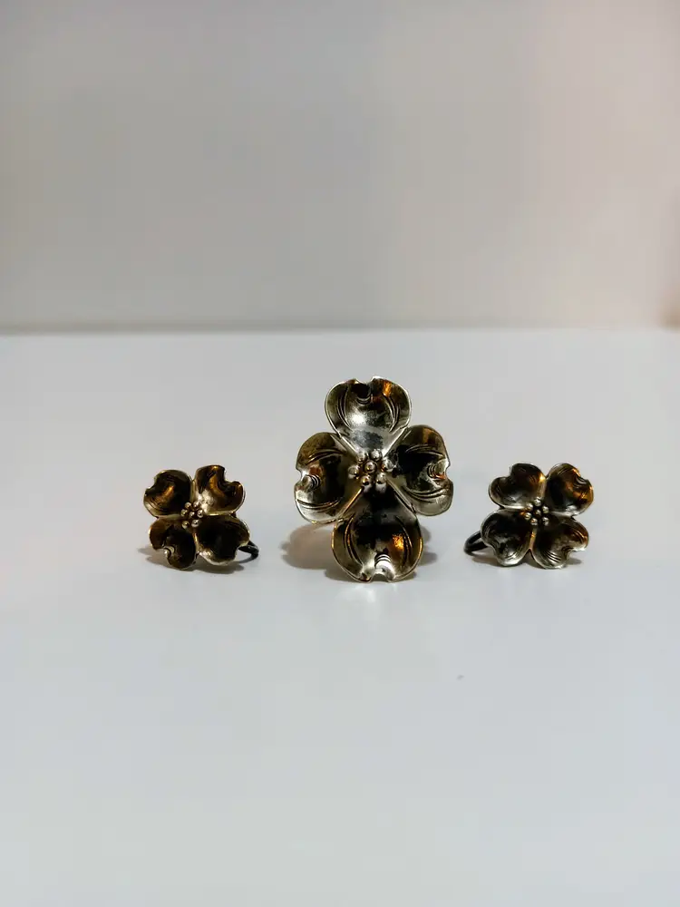 Charming Stuart Nye Sterling Silver Dogwood Blossom Ring w/Matching Screw Back Earrings; All Pieces Marked Nye; Sterling; Ring is Adjustable Size 5+; Ring 1" L x .50" W; Earrings .50" L x .50" W