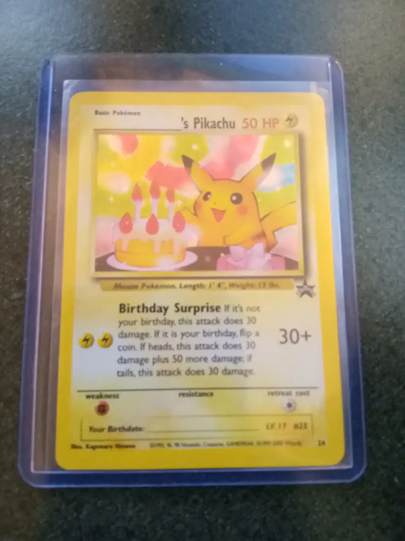 ____'s Pikachu card. It's vintage for 1995 Birthday promotional.
