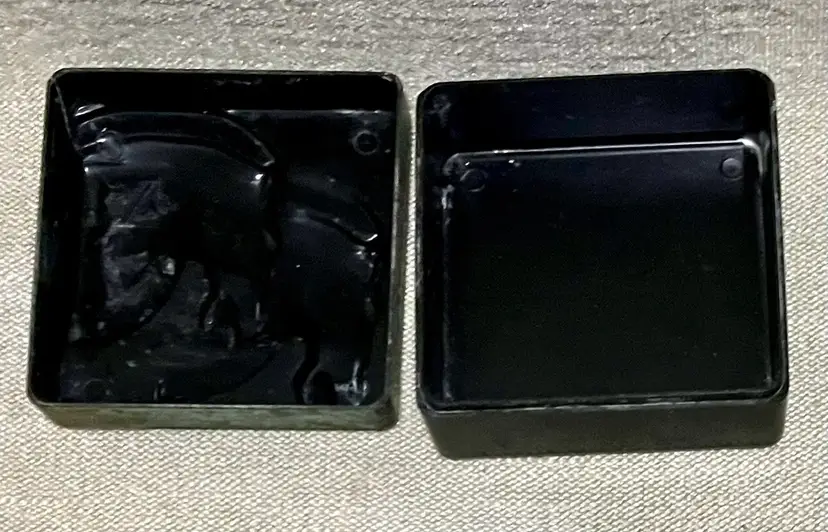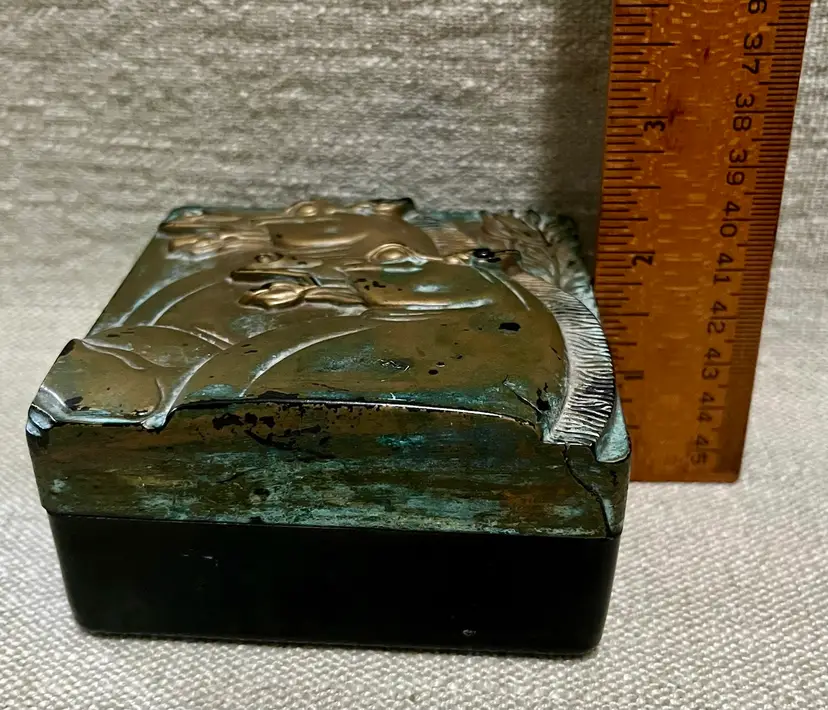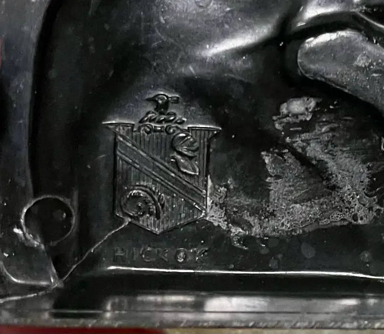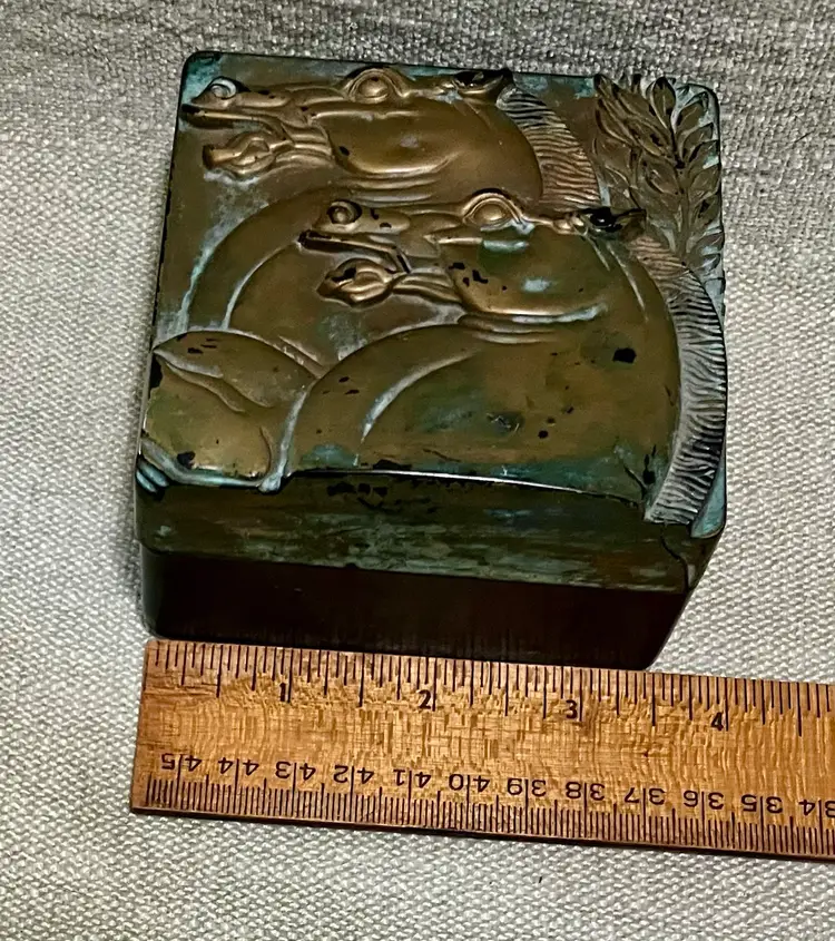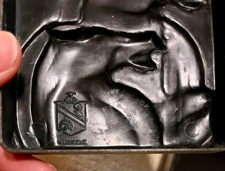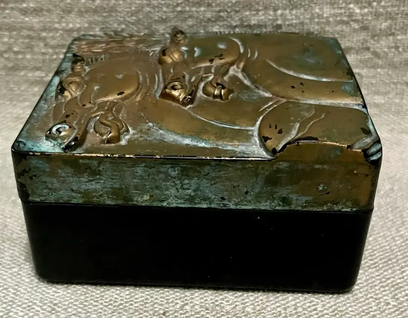 The S. Rae Hickok Double Horse Relief Square Box is an upscale men's accessory that embodies the Edwardian to Mid-Century Modern style. This medium-sized trinket box features a square shape with a unique relief design of horses, making it a perfect addition to any room. The antique black finish and two-tone color scheme of matte gold and black with a "patina" . The double horsehead design was one of several distinct styles of vintage boxes used by the Hickok company. Examples of items originally found in these boxes are Tie clips and bars, Cuff links, Pendant necklaces, Pocket watch chains. Made in the United States.