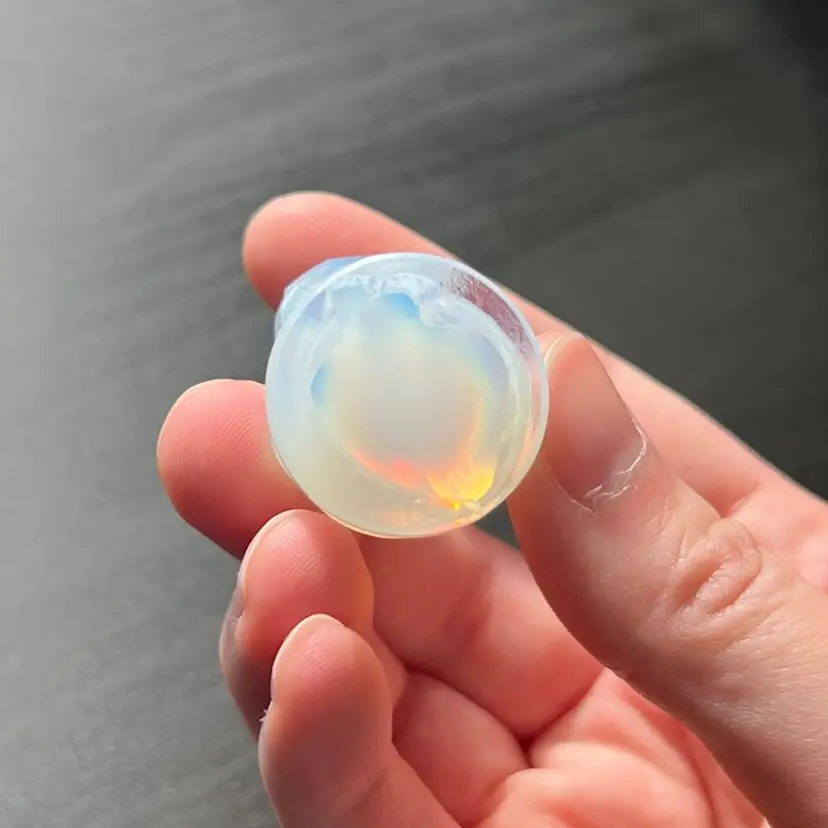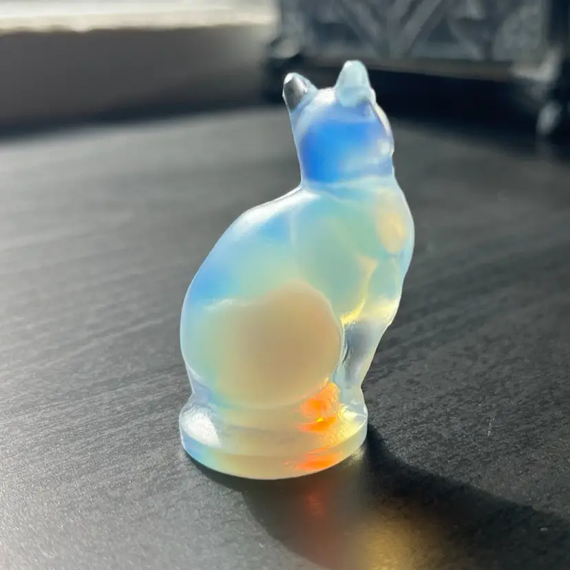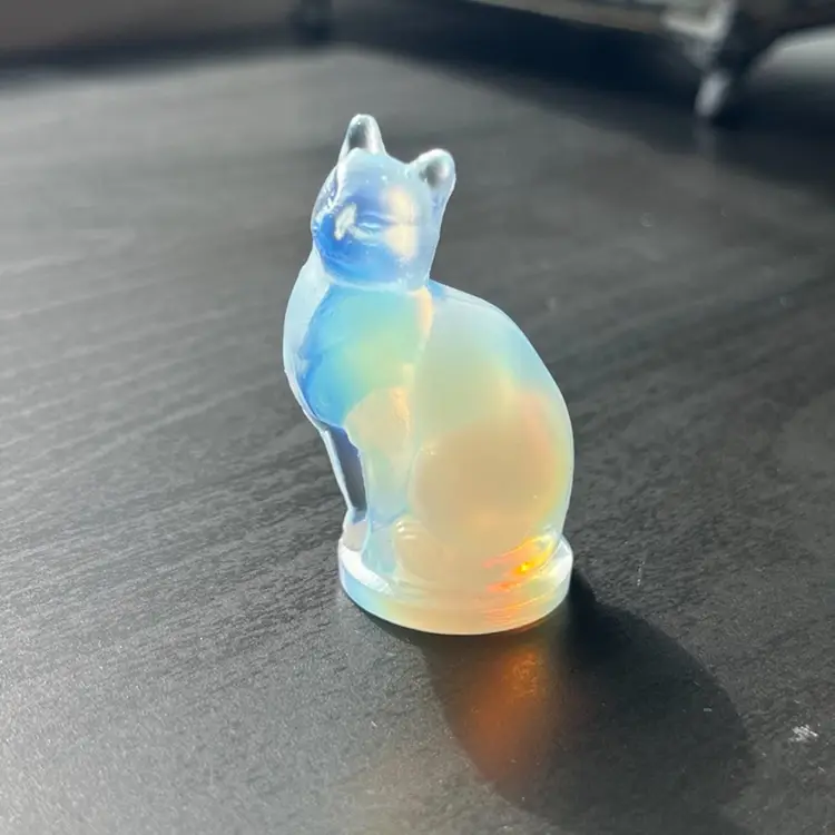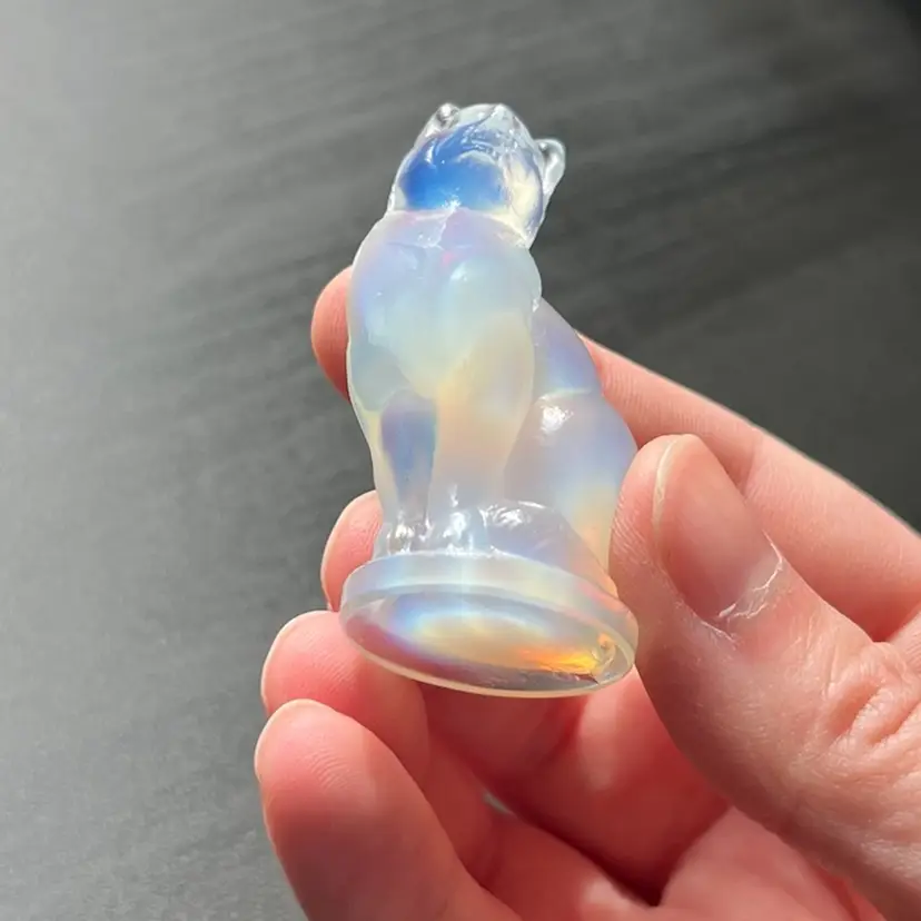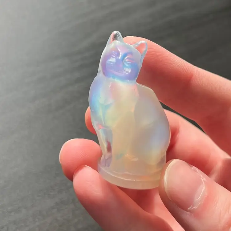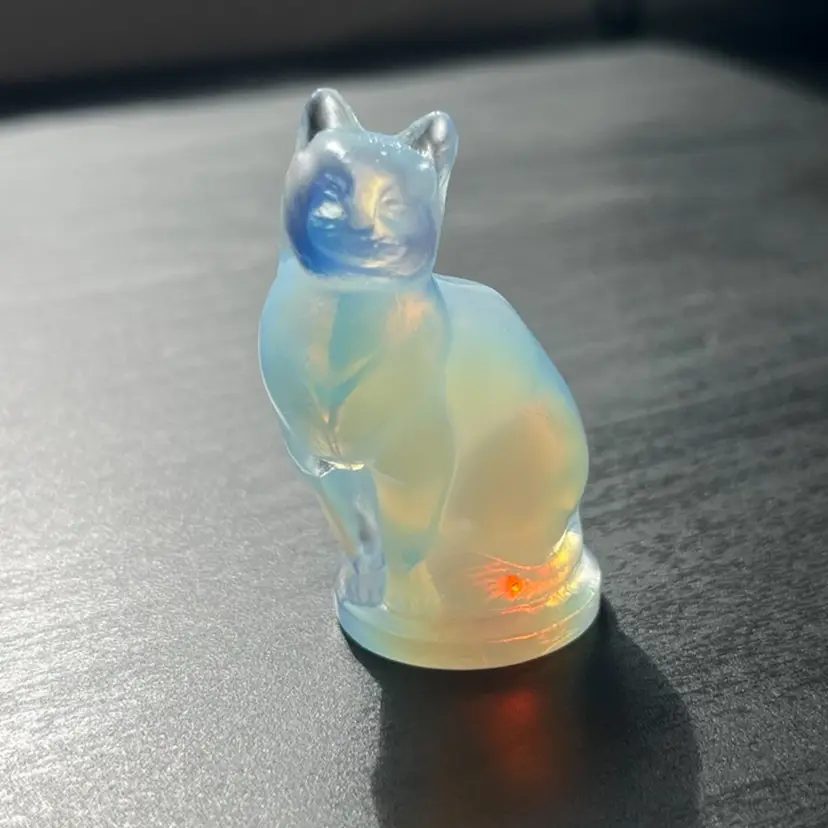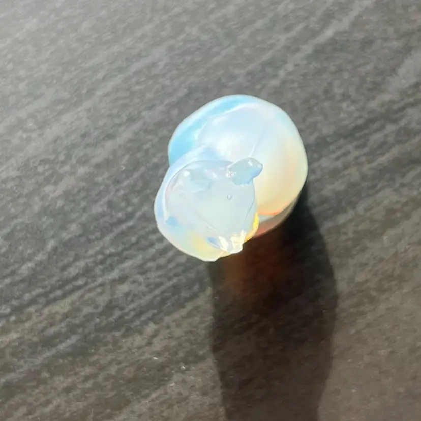 Approximately 1.25” x 1” x just over 1.75” No chips or cracks. The coloring of the glass shifts from opalescent milky white, blues, purples, and yellow-oranges depending on the light. These photos/video were taken in natural early afternoon sunlight.