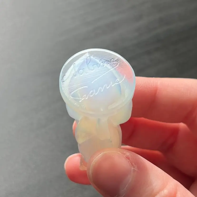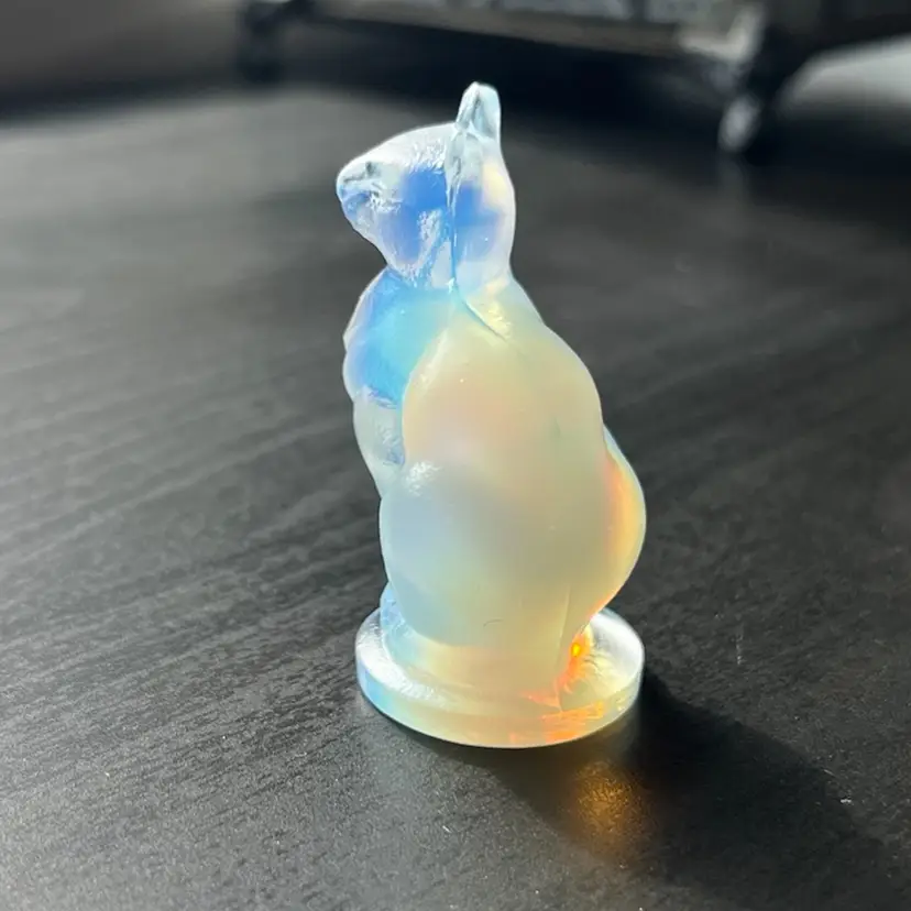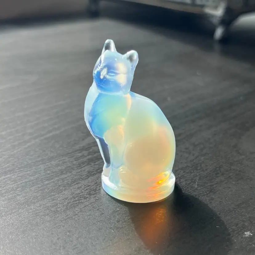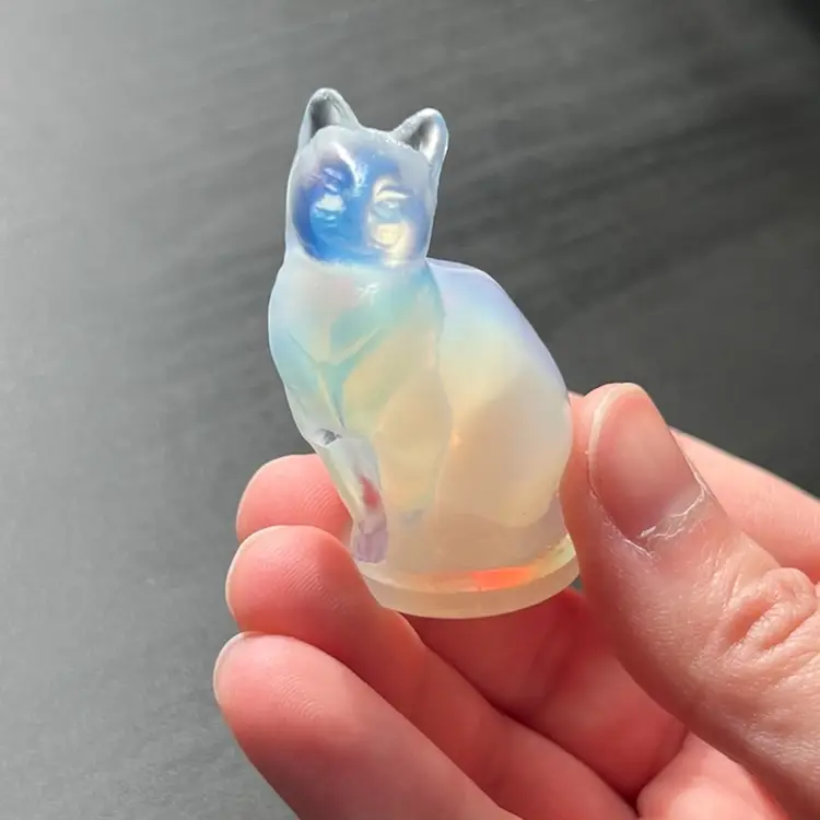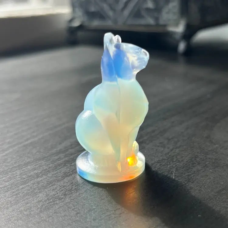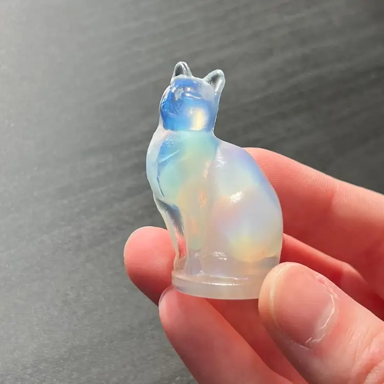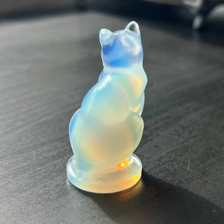 Approximately 1.25” x 1” x just over 1.75” No chips or cracks. The coloring of the glass shifts from opalescent milky white, blues, purples, and yellow-oranges depending on the light. These photos/video were taken in natural early afternoon sunlight.
