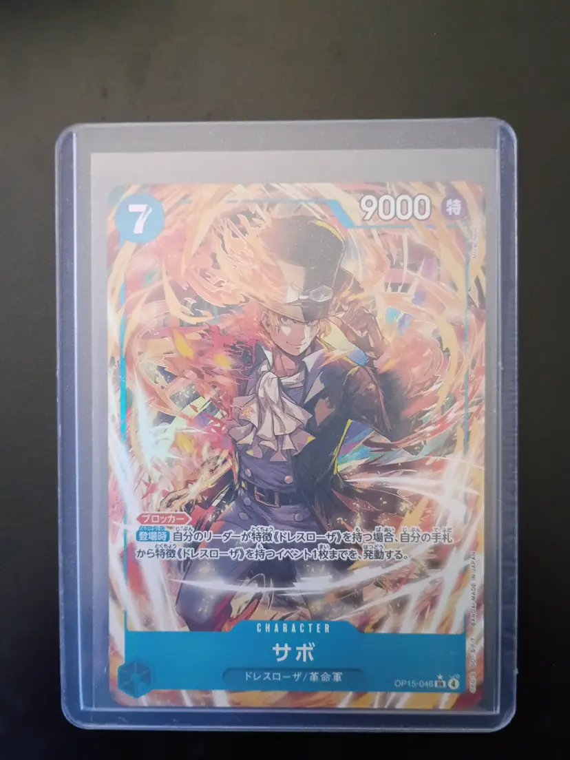 Stunning Sabo holographic trading card in protective sleeve. A vibrant addition for any One Piece card collector!