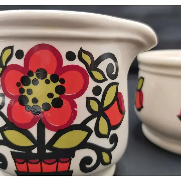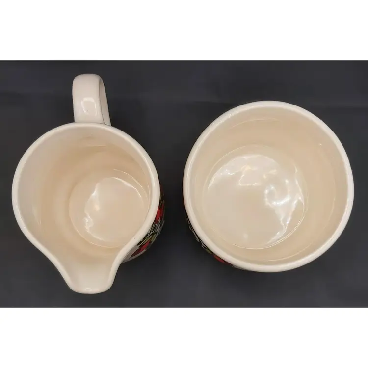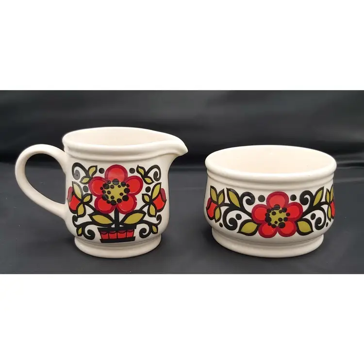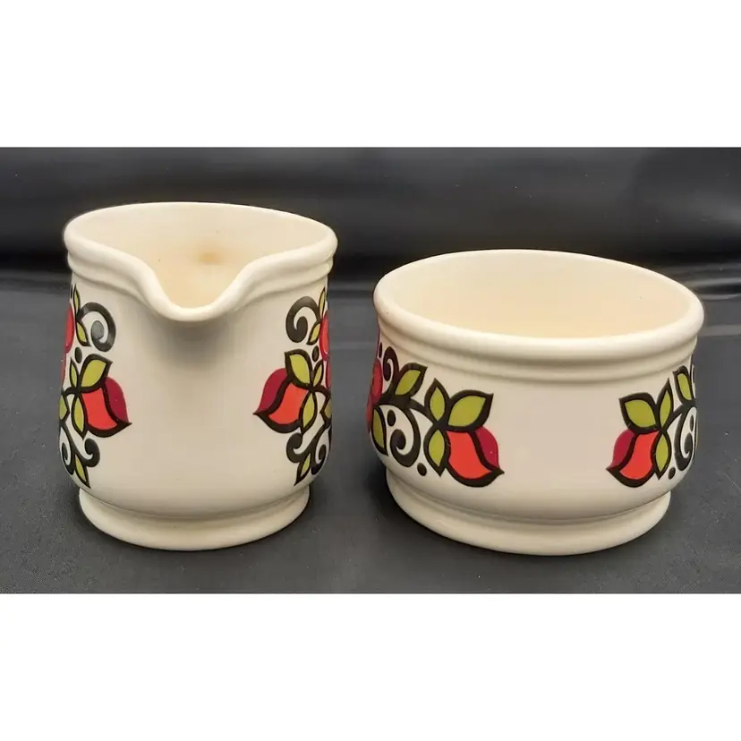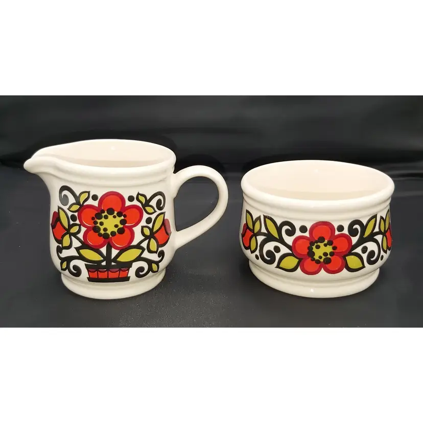So bright and fun! This set is in great condition, no chips or cracks, slight wear on the flower, natural crazing start on the base of the sugar. See pictures for details. Open sugar measures approx. 3 3/4" wide diameter x 2 1/2" high. Creamer measures approx. 4 3/4" long including handle x 3" wide bowl x 3 1/8" high.