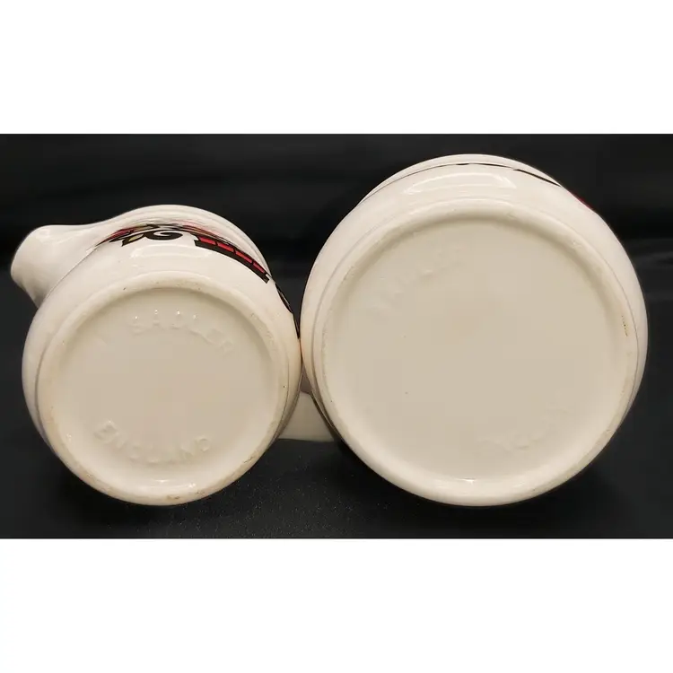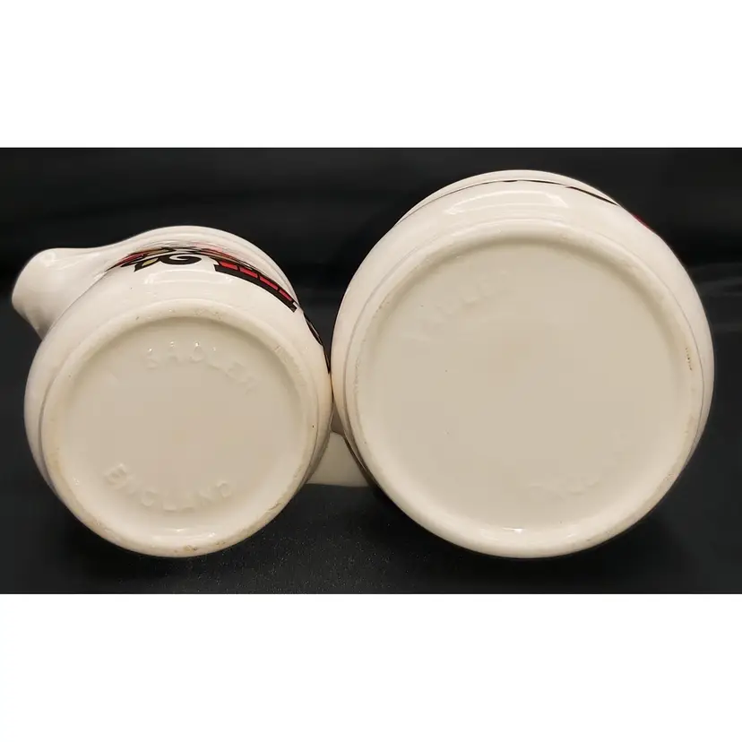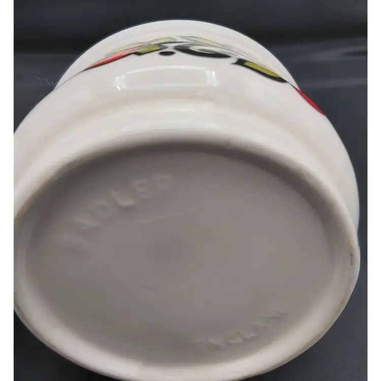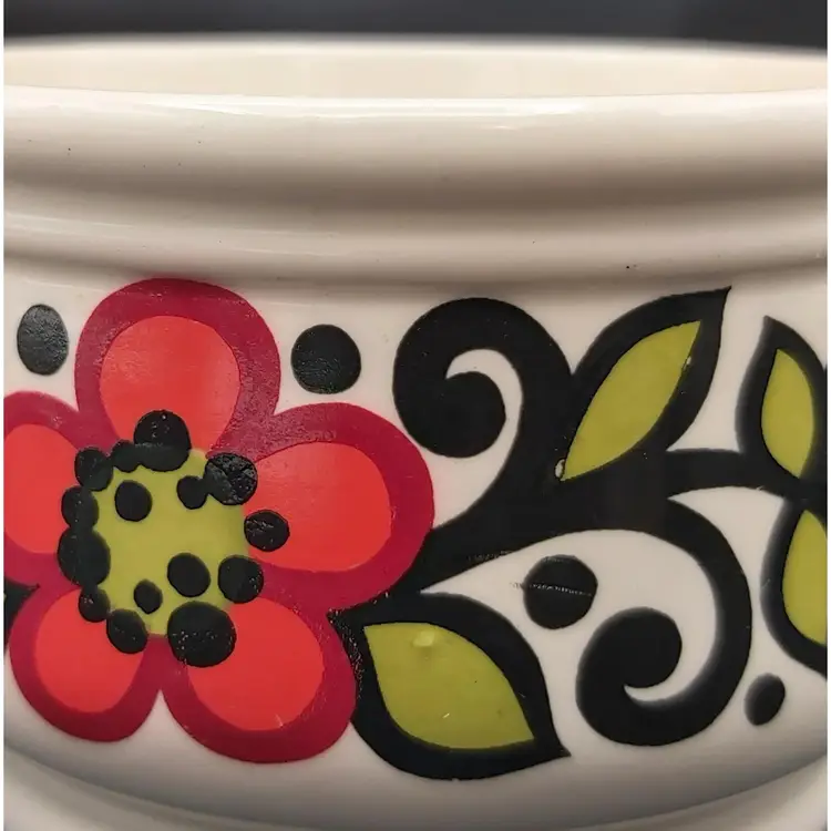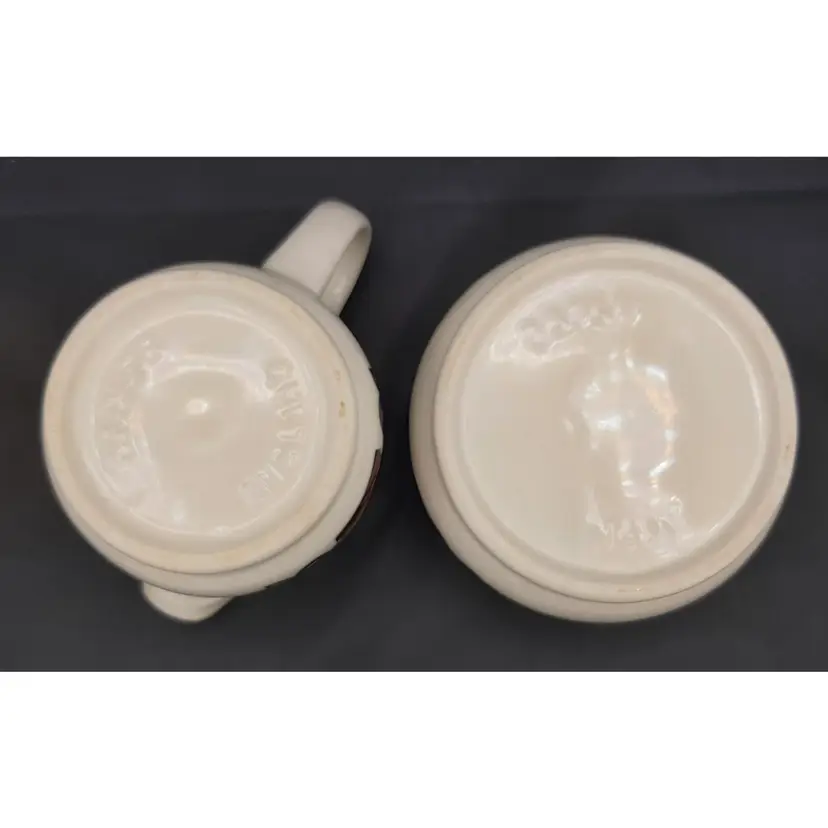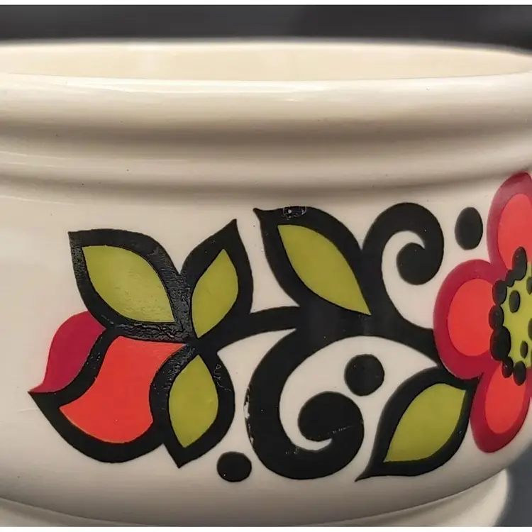 So bright and fun! This set is in great condition, no chips or cracks, slight wear on the flower, natural crazing start on the base of the sugar. See pictures for details. Open sugar measures approx. 3 3/4" wide diameter x 2 1/2" high. Creamer measures approx. 4 3/4" long including handle x 3" wide bowl x 3 1/8" high.